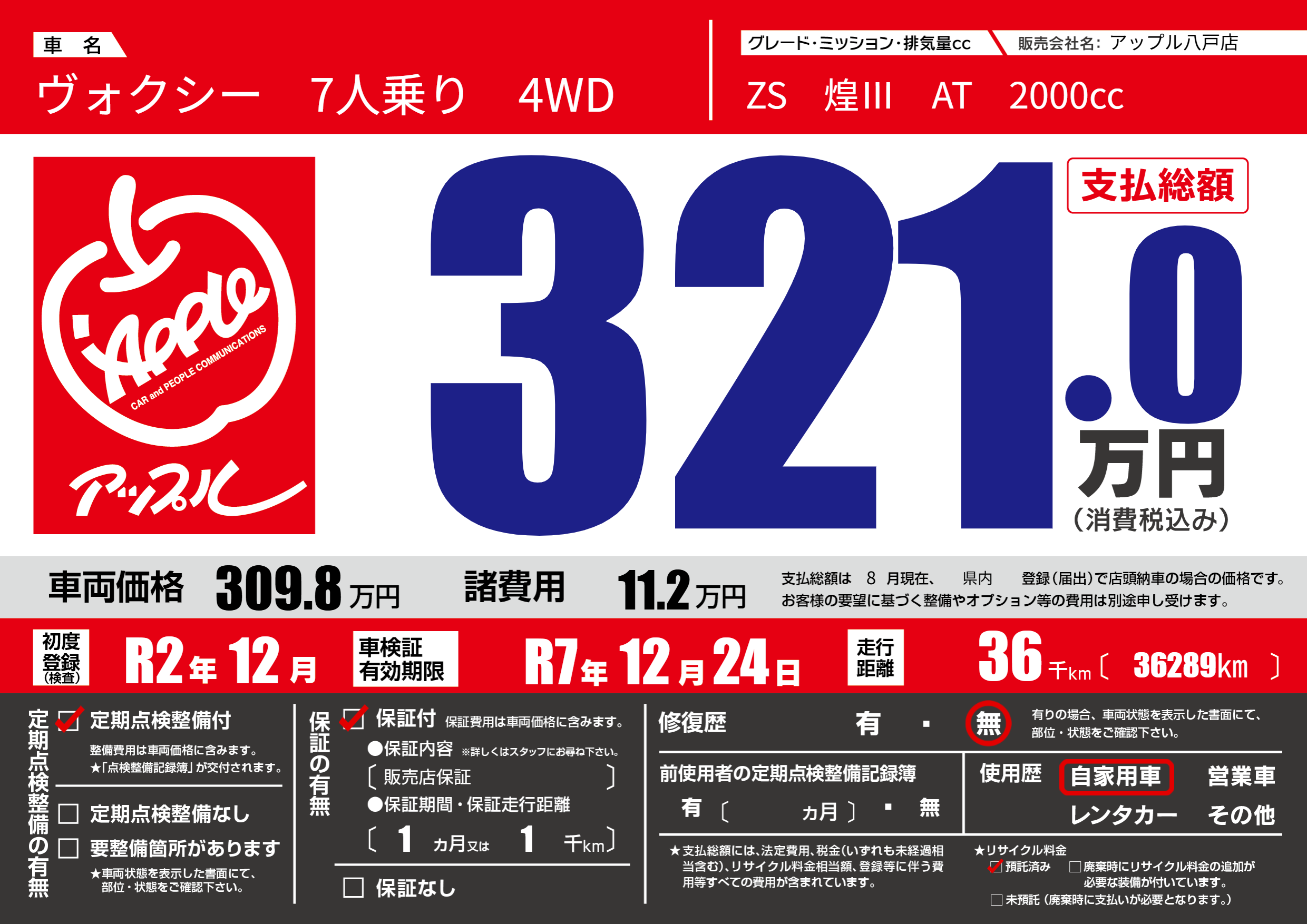 | 車名 | ヴォクシー 7人乗り 4WD | グレード ミッション 排気量 |