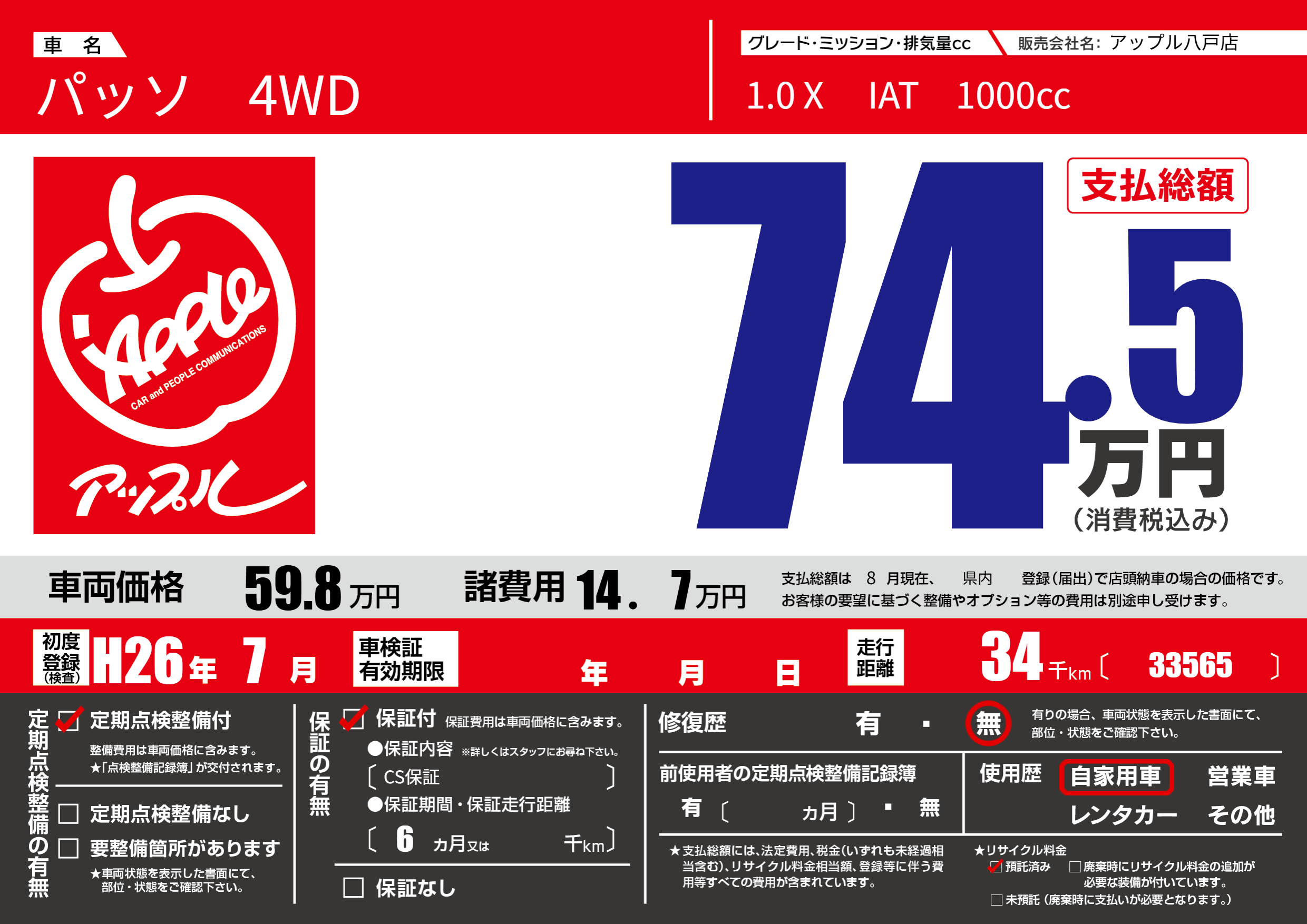 | 車名 | パッソ 4WD | グレード ミッション 排気量 |