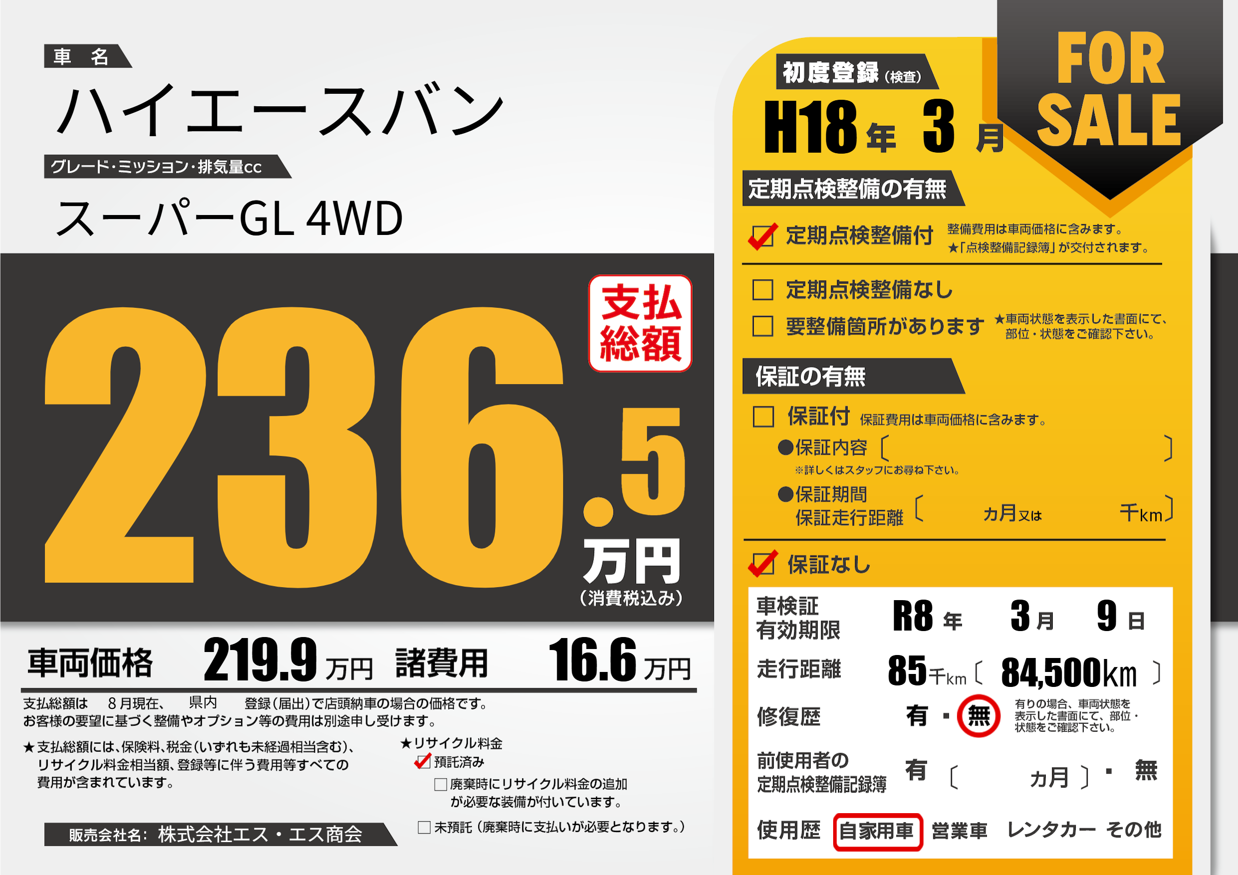 | 走行キロ | 8.5万km | 初年度登録 | H18年3月 |