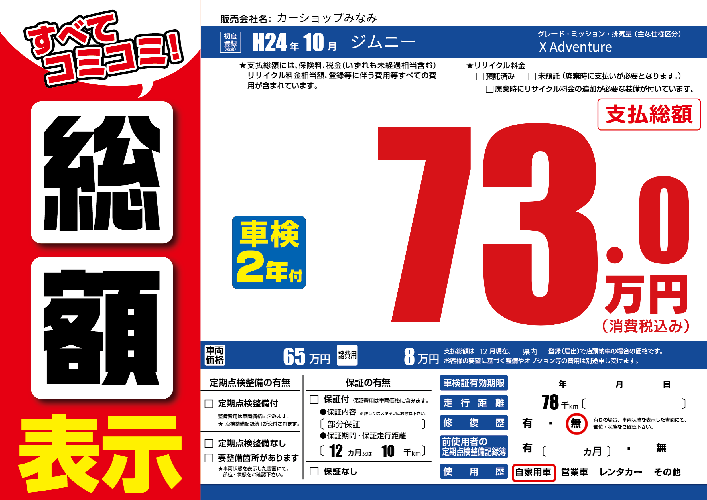| 車名 | ジムニー | グレード ミッション 排気量 |