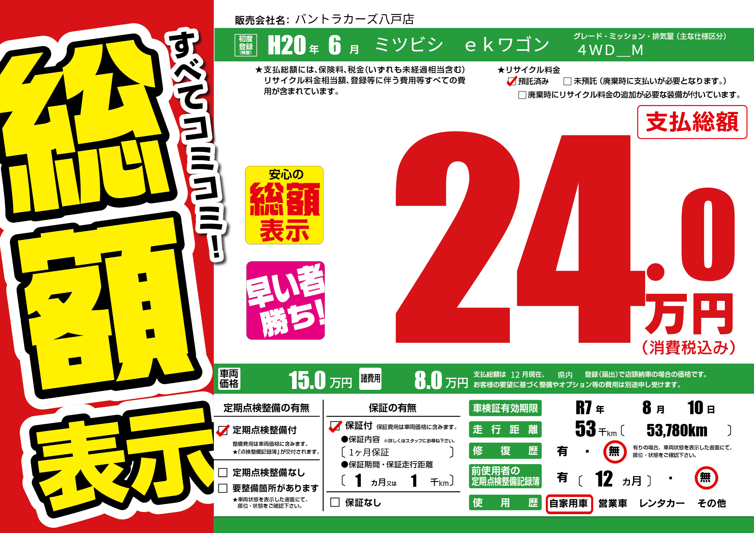 | 車名 | ミツビシ ekワゴン | グレード ミッション 排気量 |