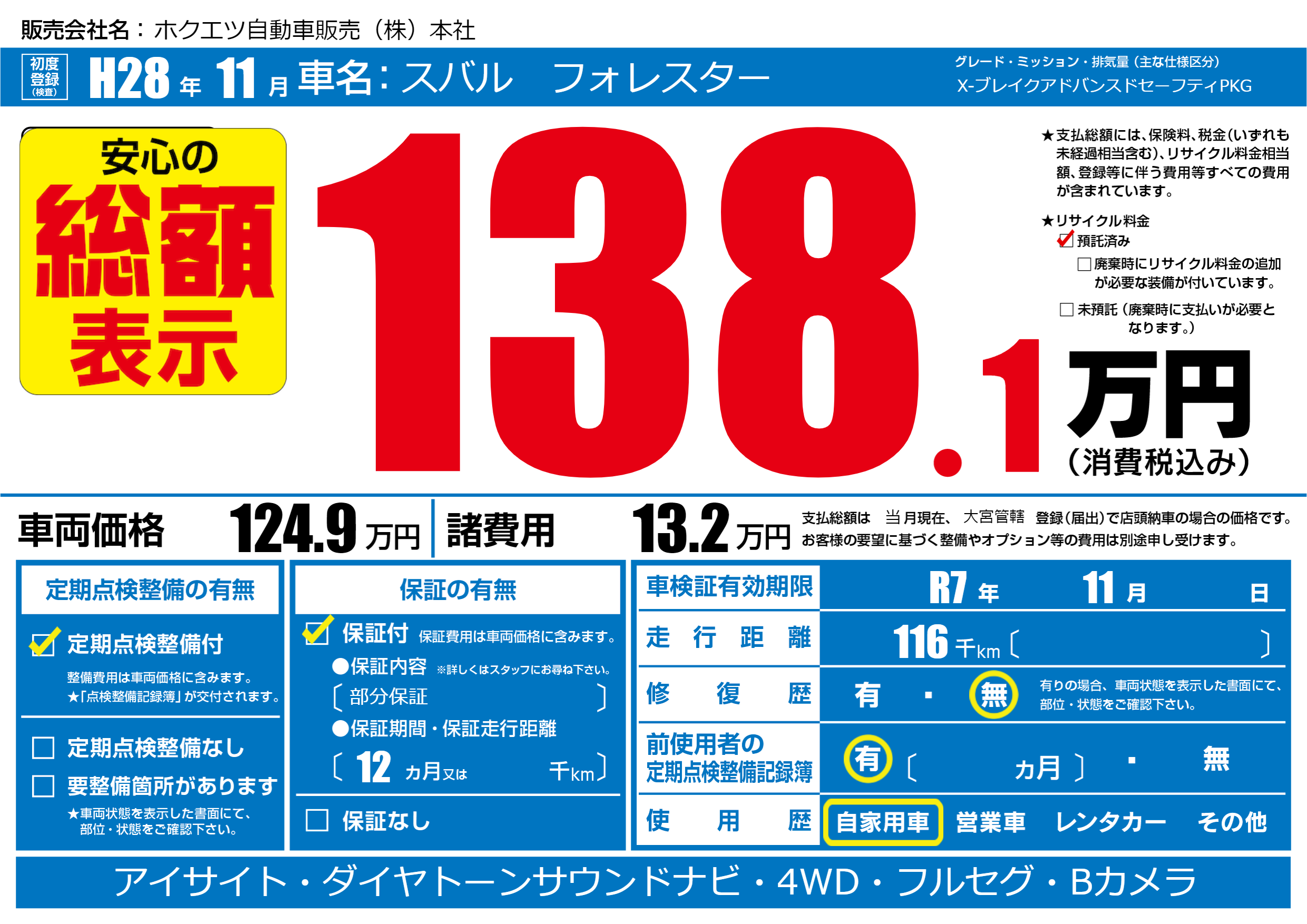 | 車名 | スバル フォレスター | グレード ミッション 排気量 |