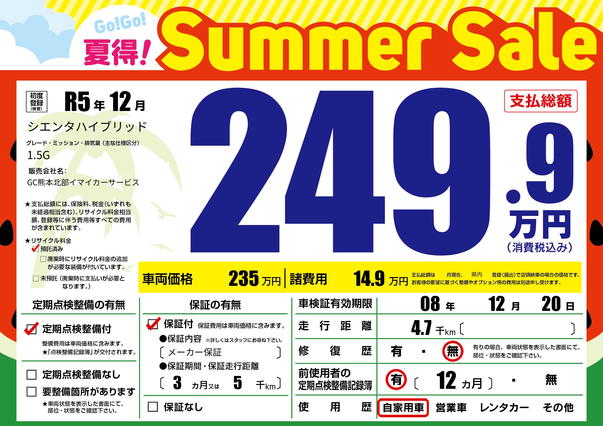 | 走行キロ | 0.4万km | 初年度登録 | R5年12月 |