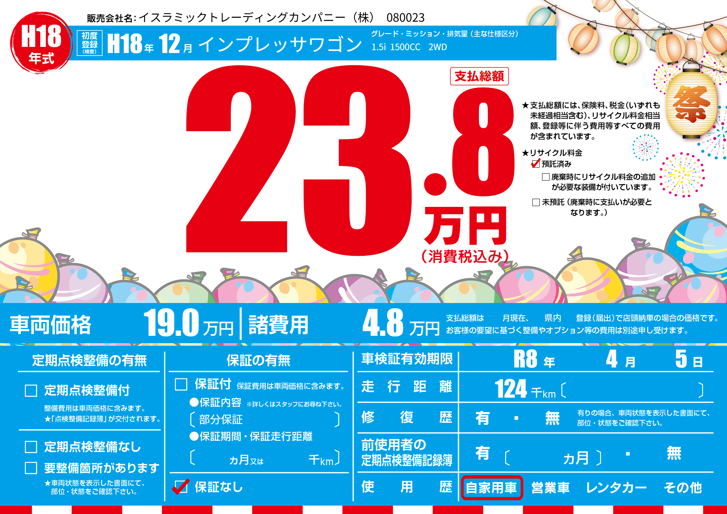 | 走行キロ | 12.4万km | 初年度登録 | H18年12月 |