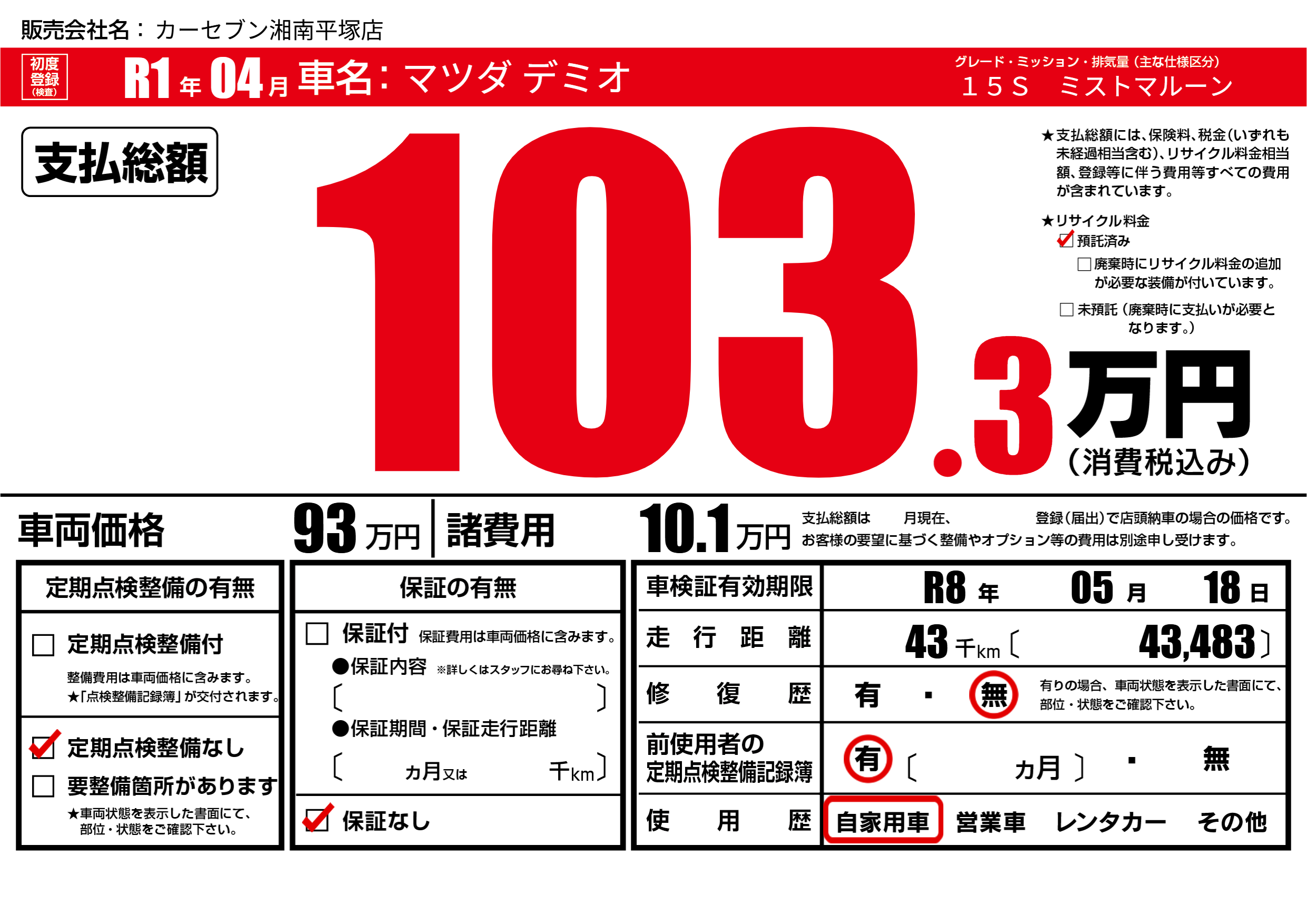 | 車名 | マツダ デミオ | グレード ミッション 排気量 |