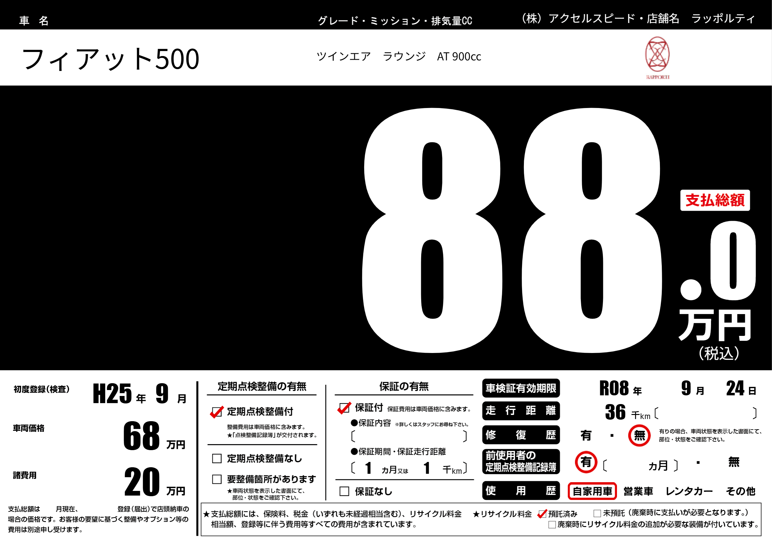 | 車名 | フィアット500 | グレード ミッション 排気量 |