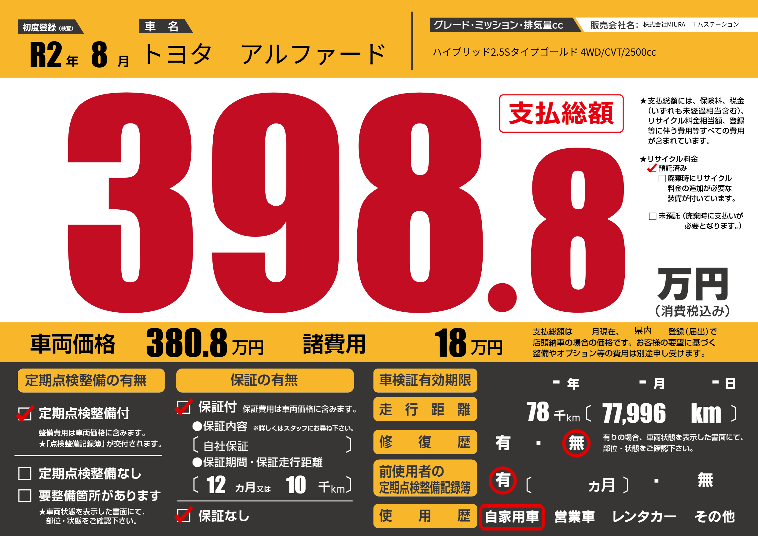 | 車名 | トヨタ アルファード | グレード ミッション 排気量 |