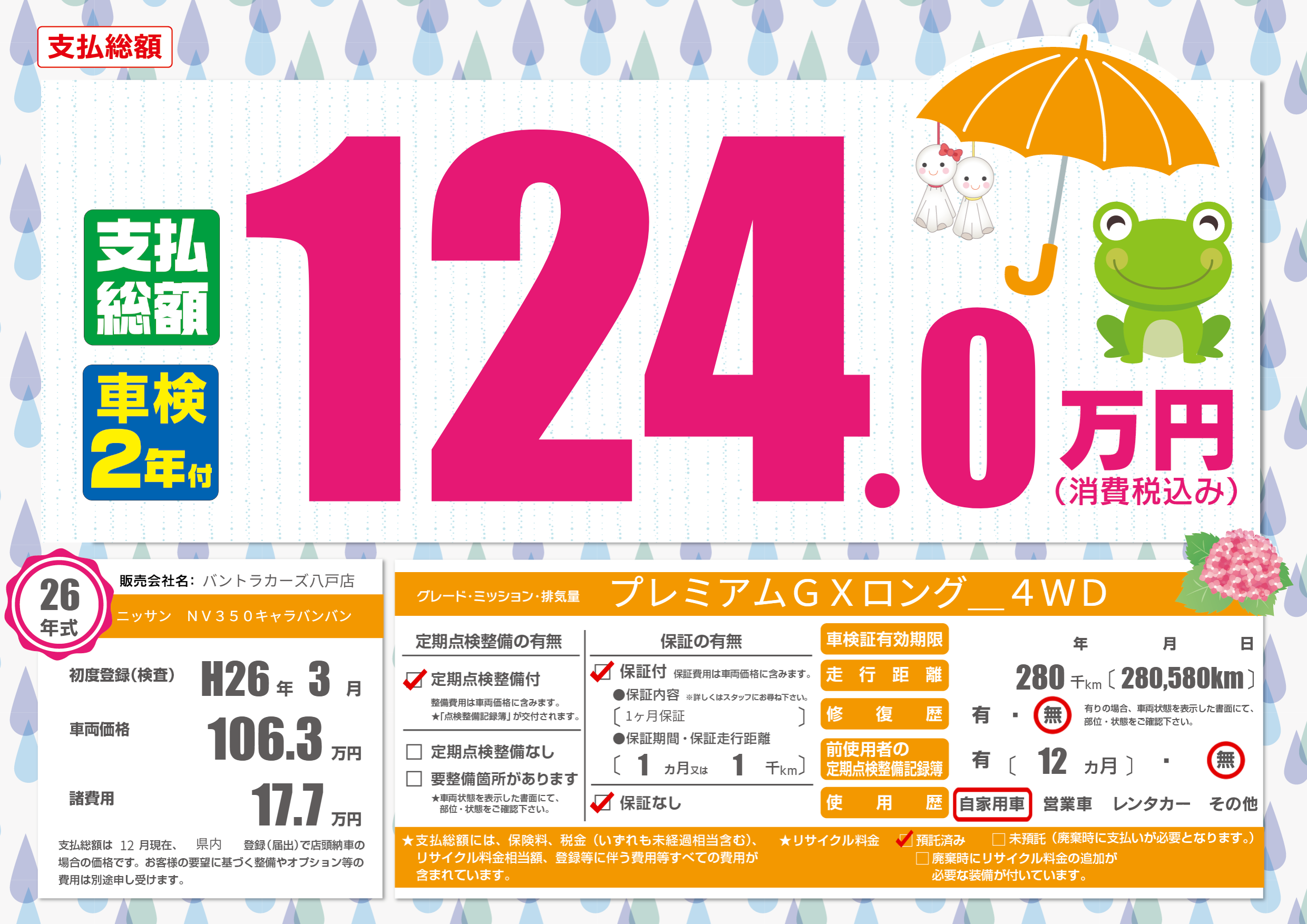 | 車名 | ニッサン NV350キャラバンバン | グレード ミッション 排気量 |