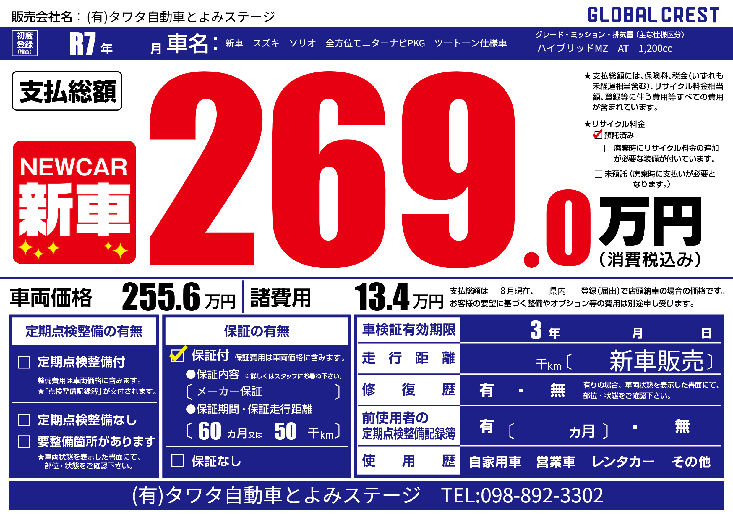 | 車名 | 新車 スズキ ソリオ 全方位モニターナビPKG ツートーン仕様車 | グレード ミッション 排気量 |