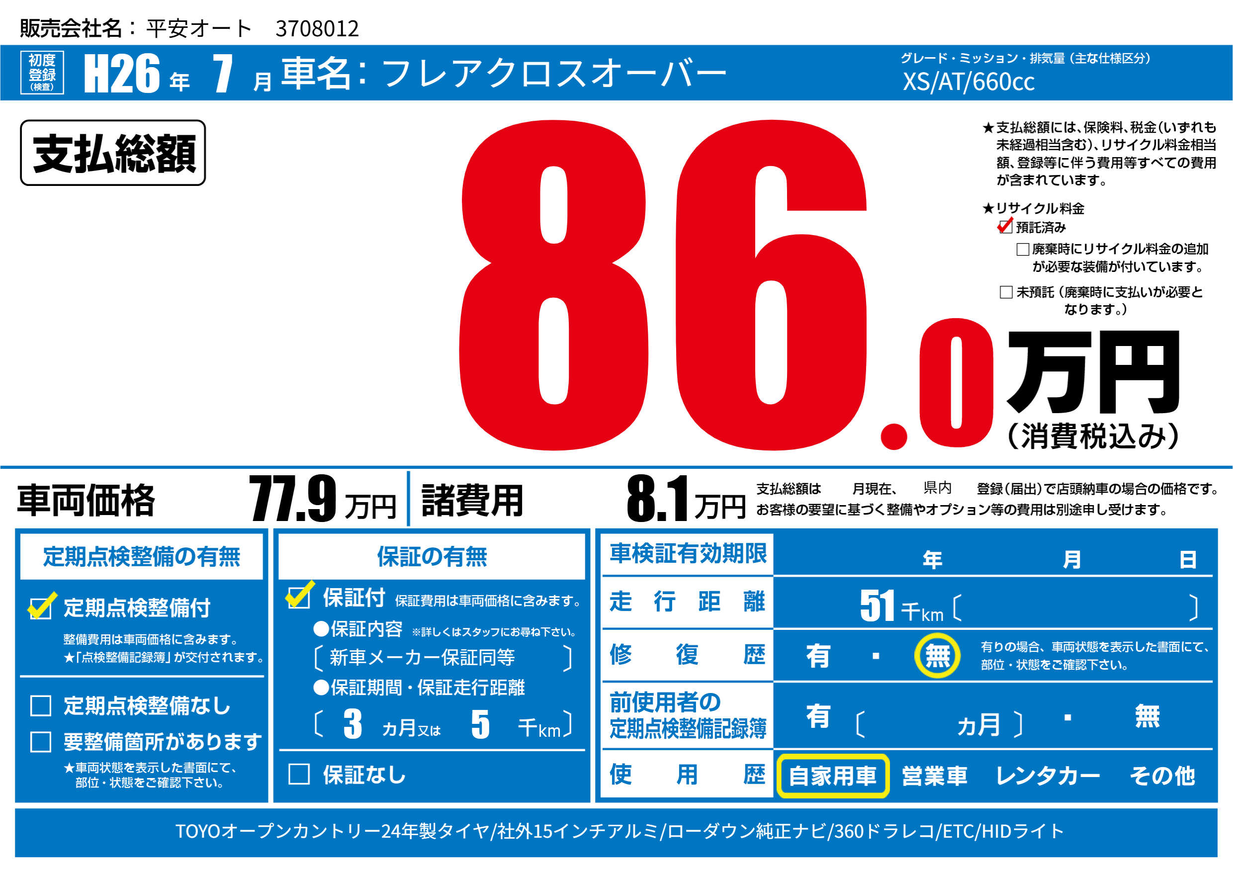 | 走行キロ | 5.1万km | 初年度登録 | H26年7月 |