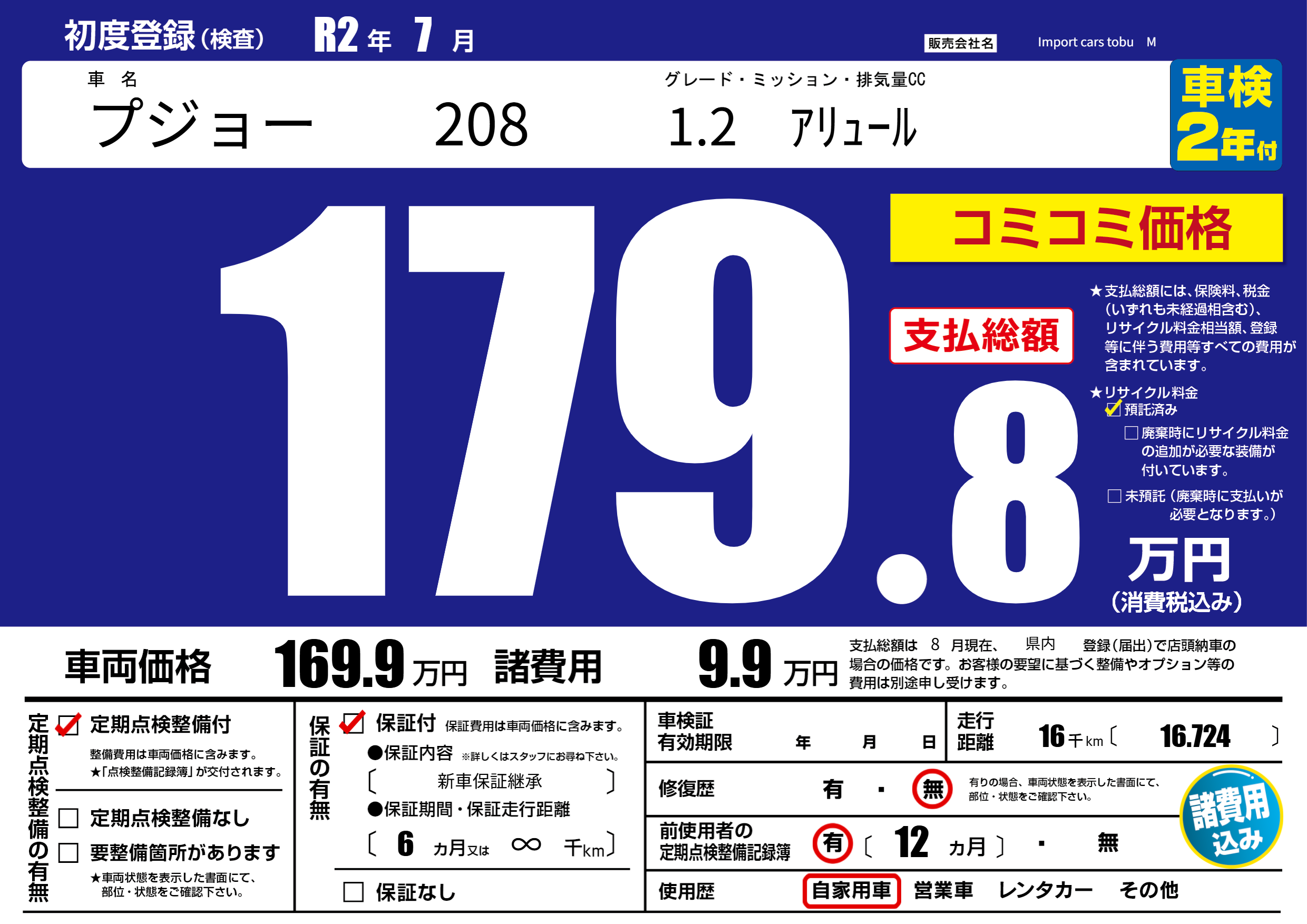 | 車名 | プジョー 208 | グレード ミッション 排気量 |