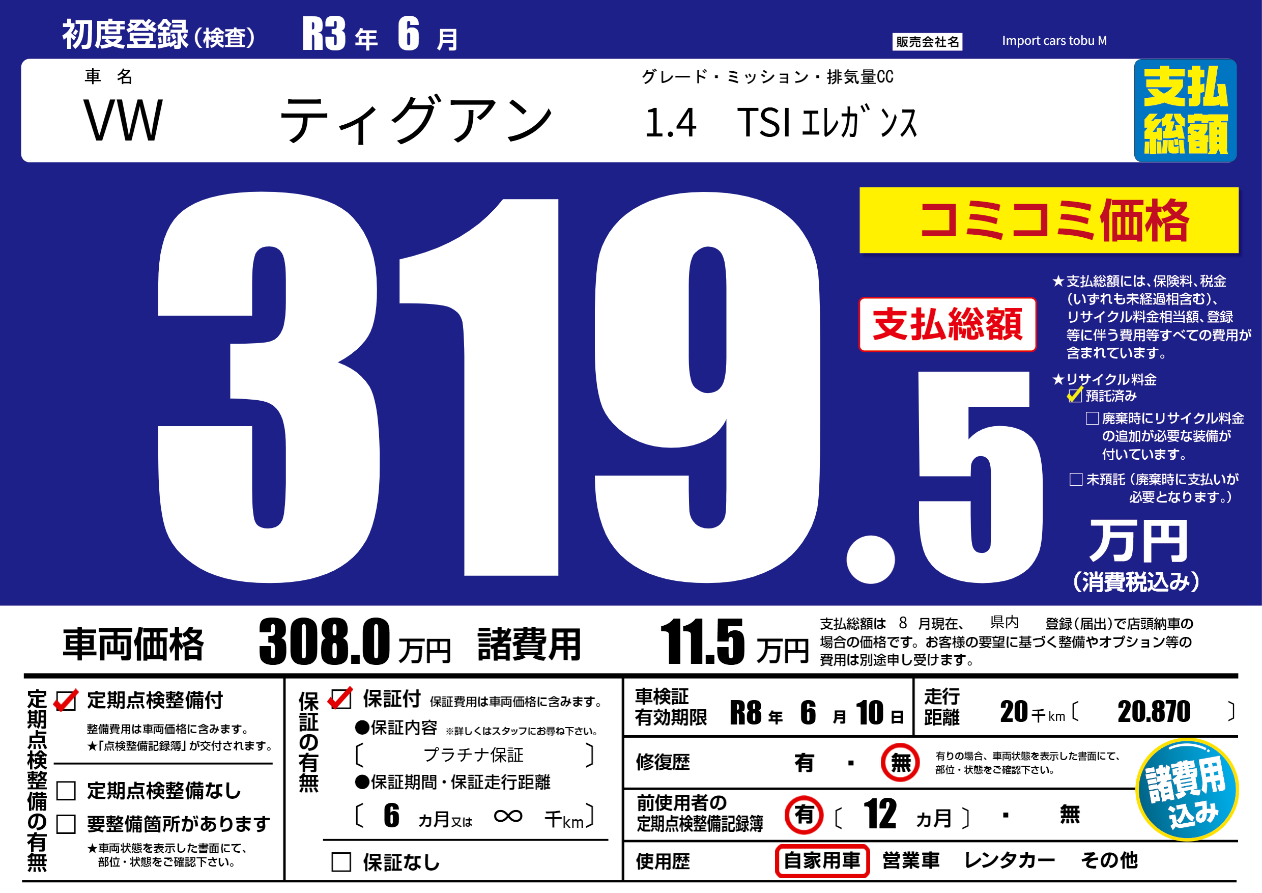 保証付き 保証内容( プラチナ保証) 6ヶ月または(∞)千kmまで |