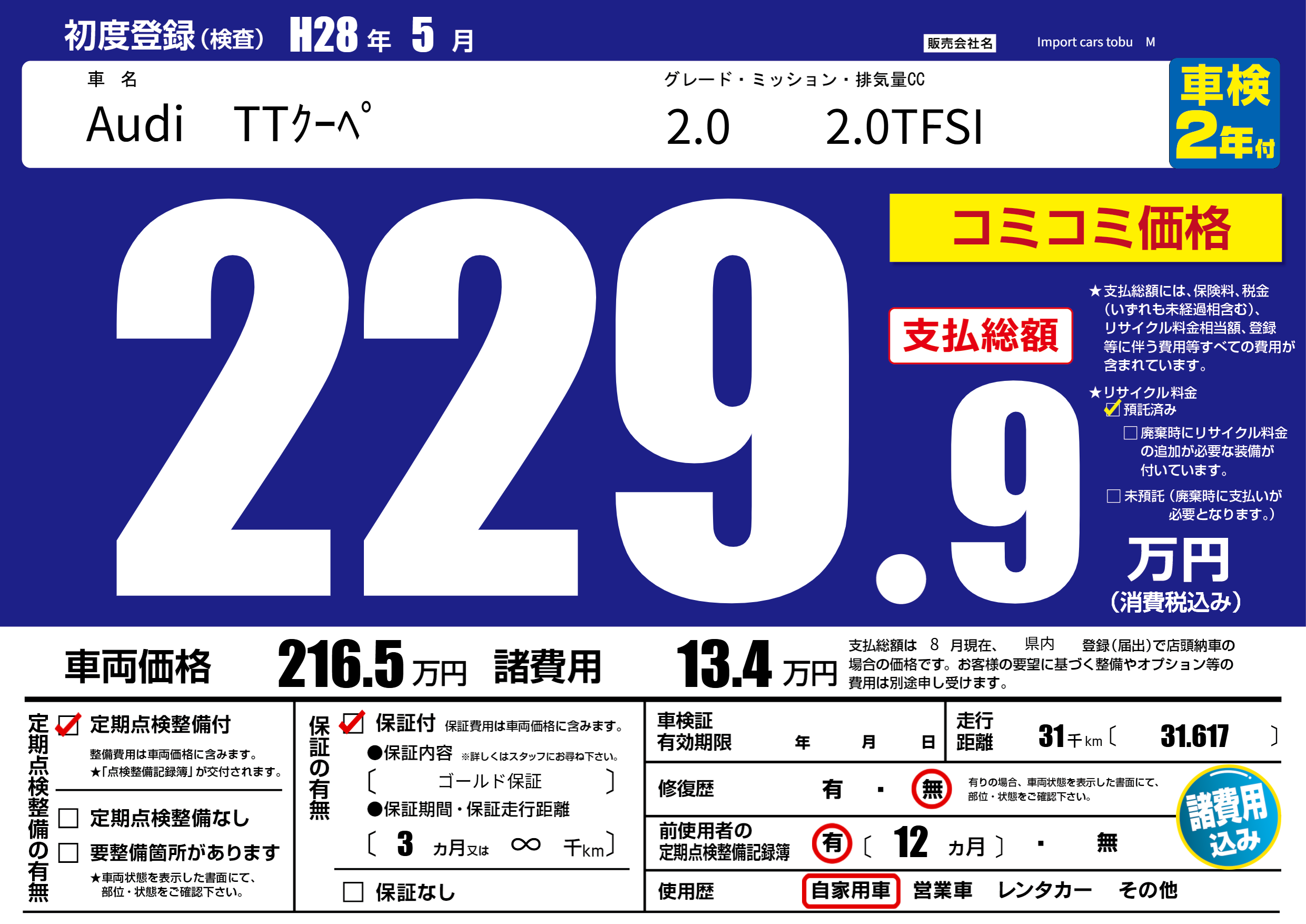 | 車名 | Audi TTクーペ | グレード ミッション 排気量 |