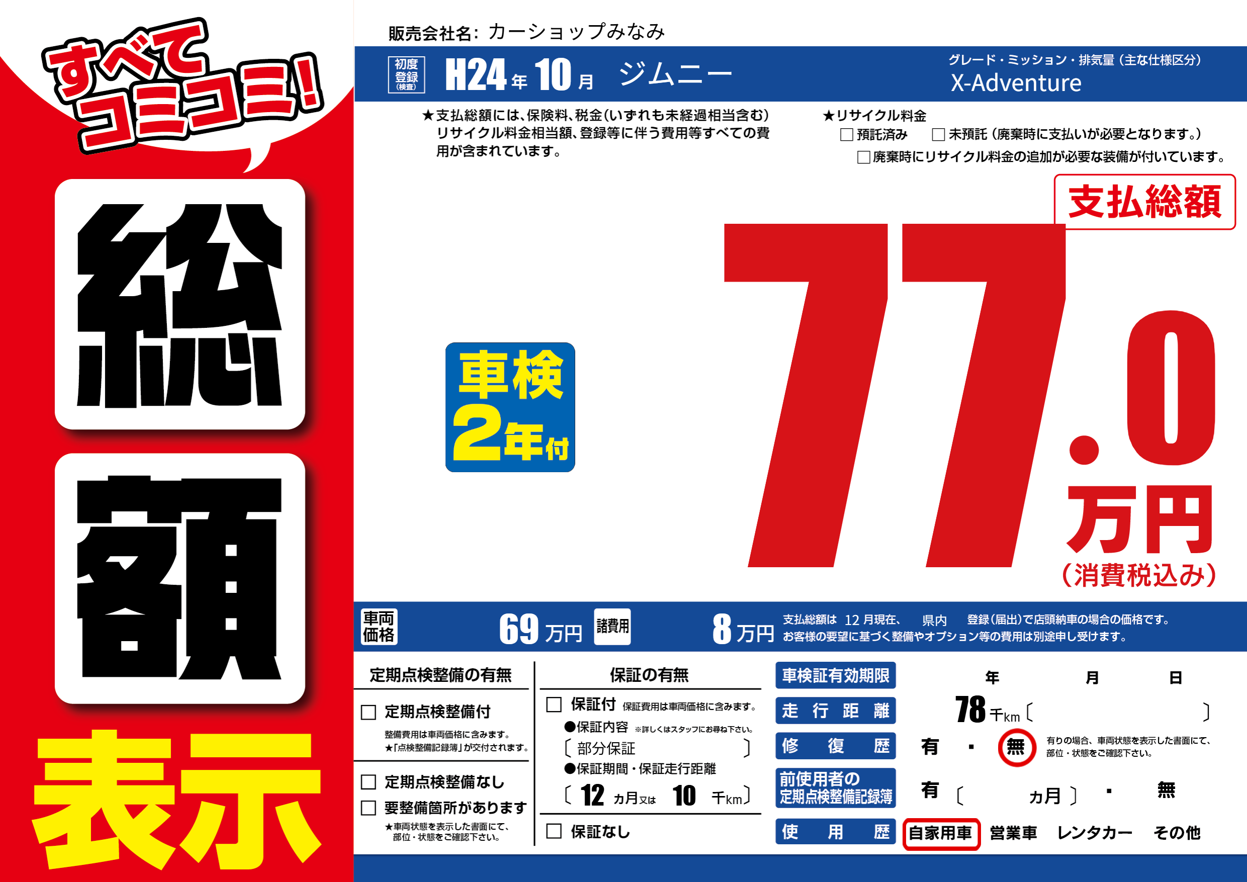 | 車名 | ジムニー | グレード ミッション 排気量 |