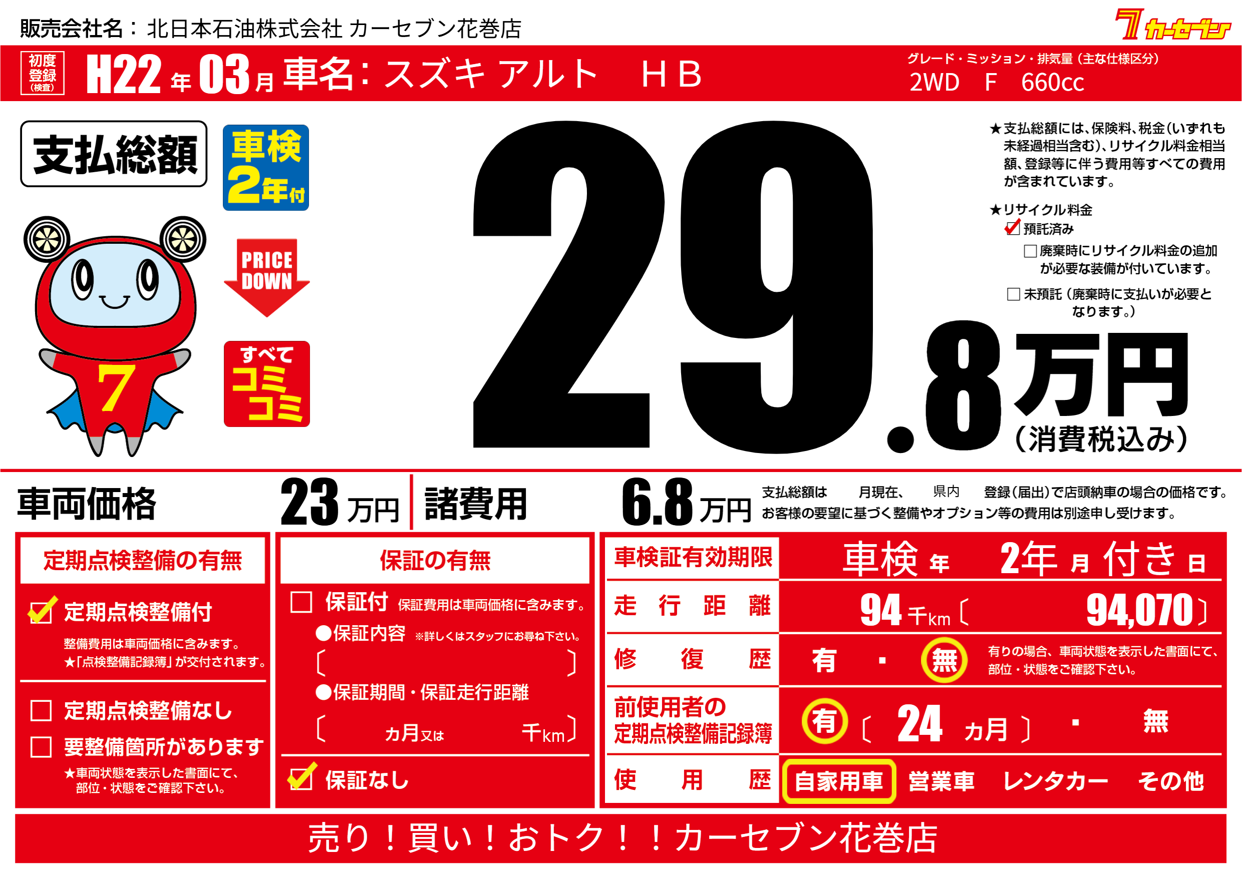 | 走行キロ | 9.4万km | 初年度登録 | H22年03月 |