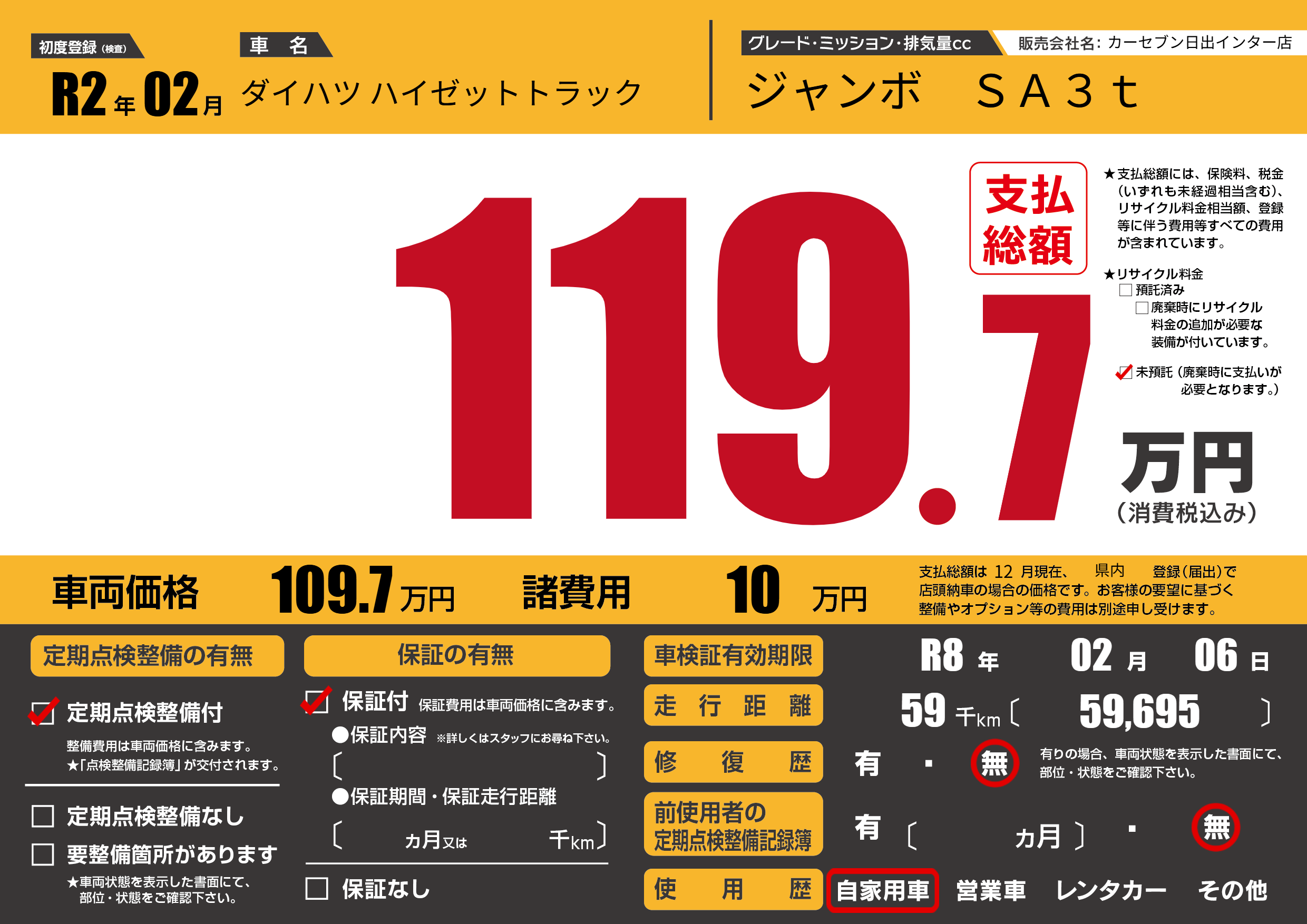 | 走行キロ | 5.9万km | 初年度登録 | R2年02月 |