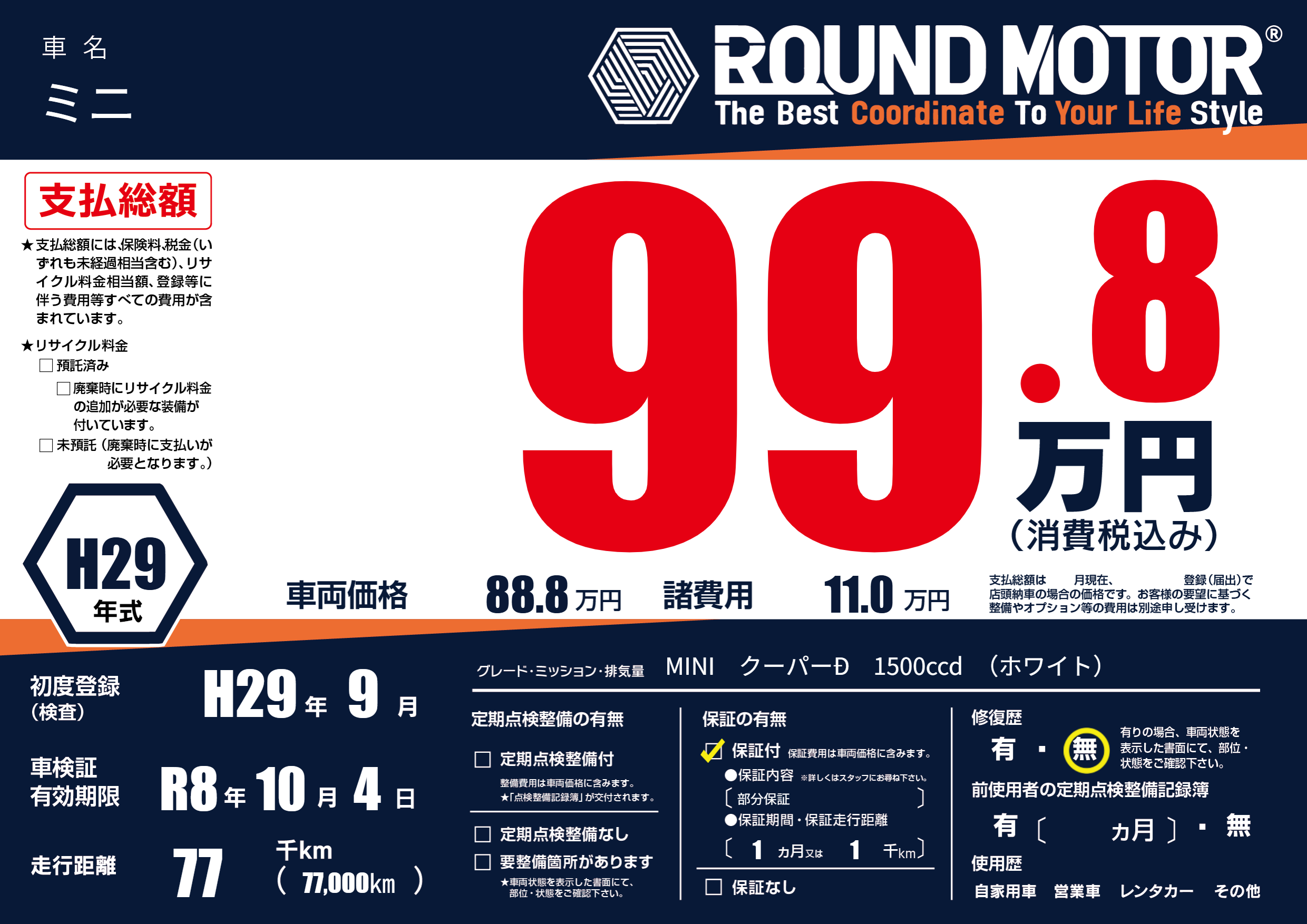 | 車名 | ミニ | グレード ミッション 排気量 |