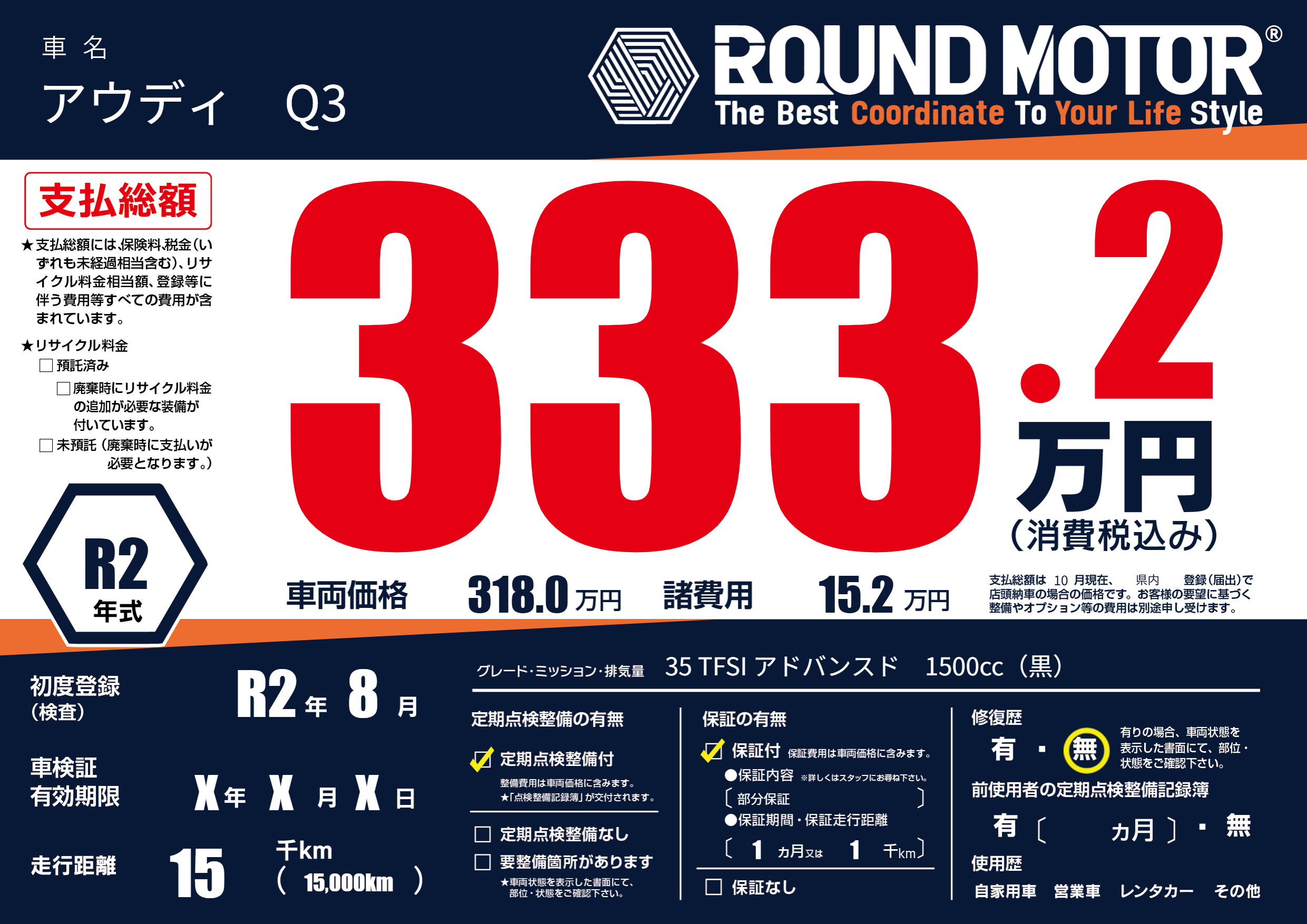 | 車名 | アウディ Q3 | グレード ミッション 排気量 |