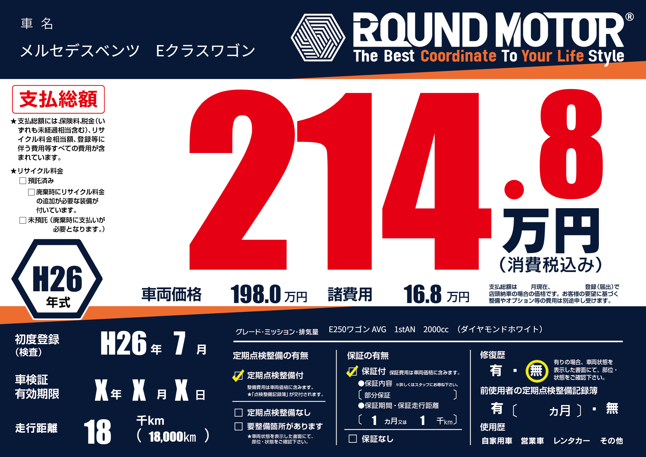 | 車名 | メルセデスベンツ Eクラスワゴン | グレード ミッション 排気量 |