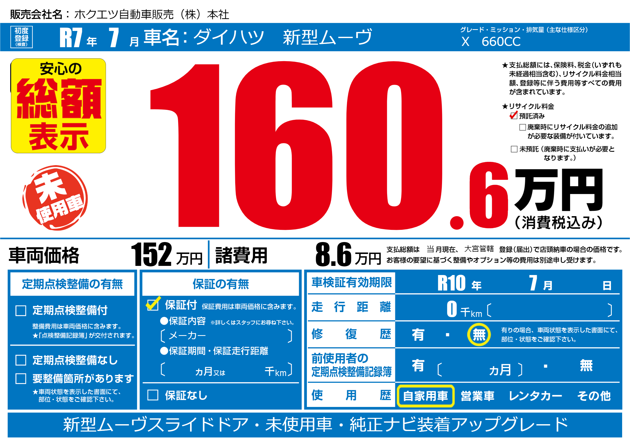 | 走行キロ | - | 初年度登録 | R7年7月 |