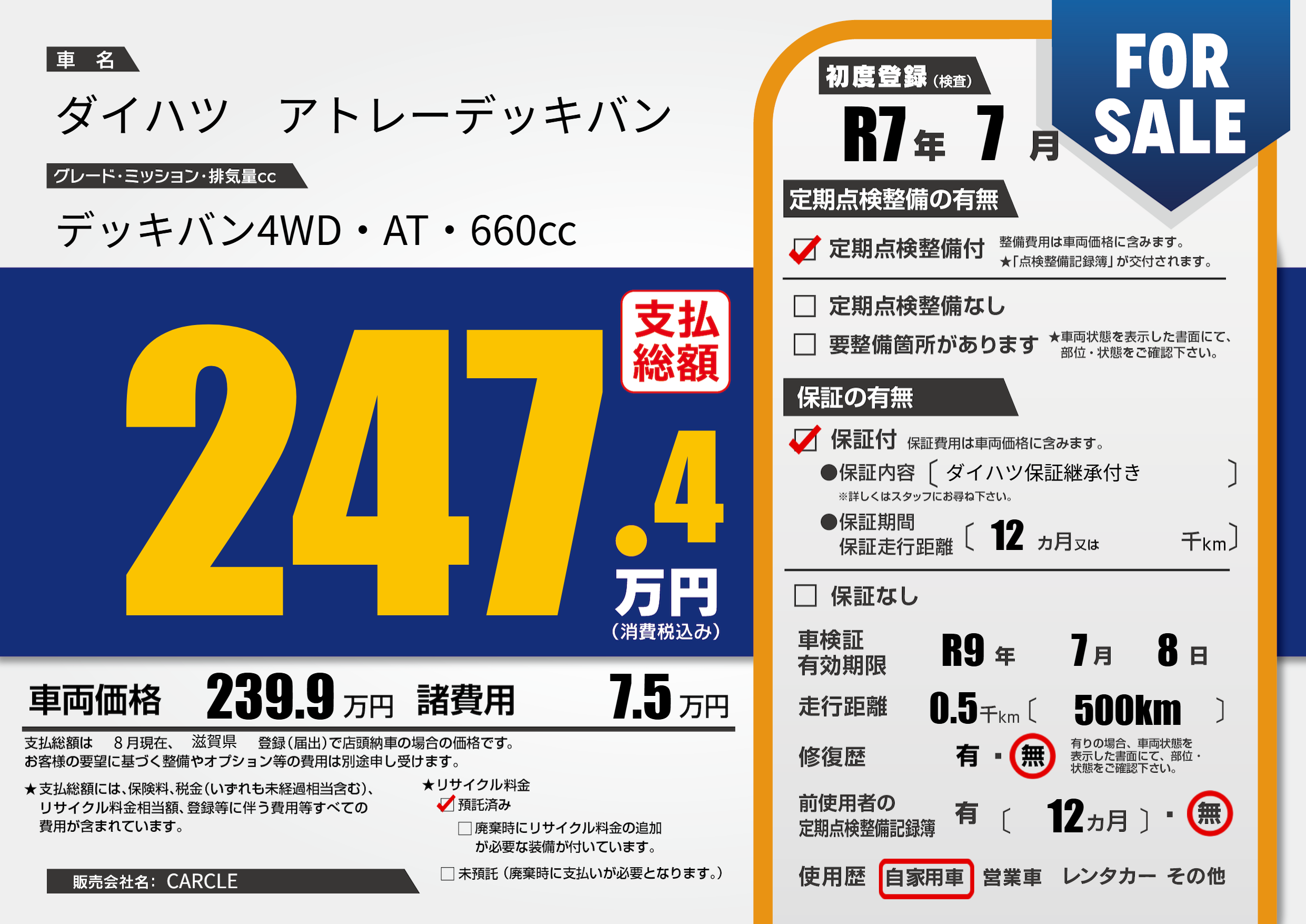 | 走行キロ | - | 初年度登録 | R7年7月 |