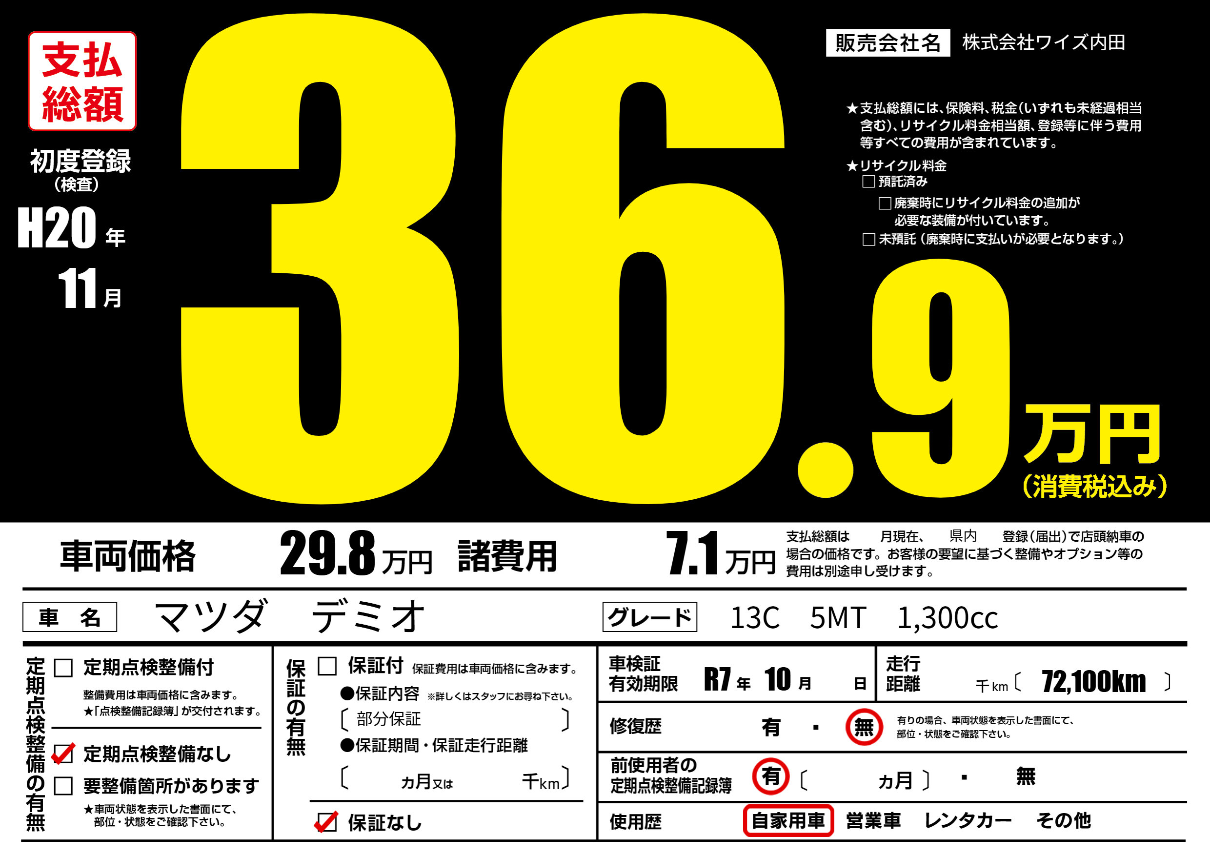 | 車名 | マツダ デミオ | グレード ミッション 排気量 |