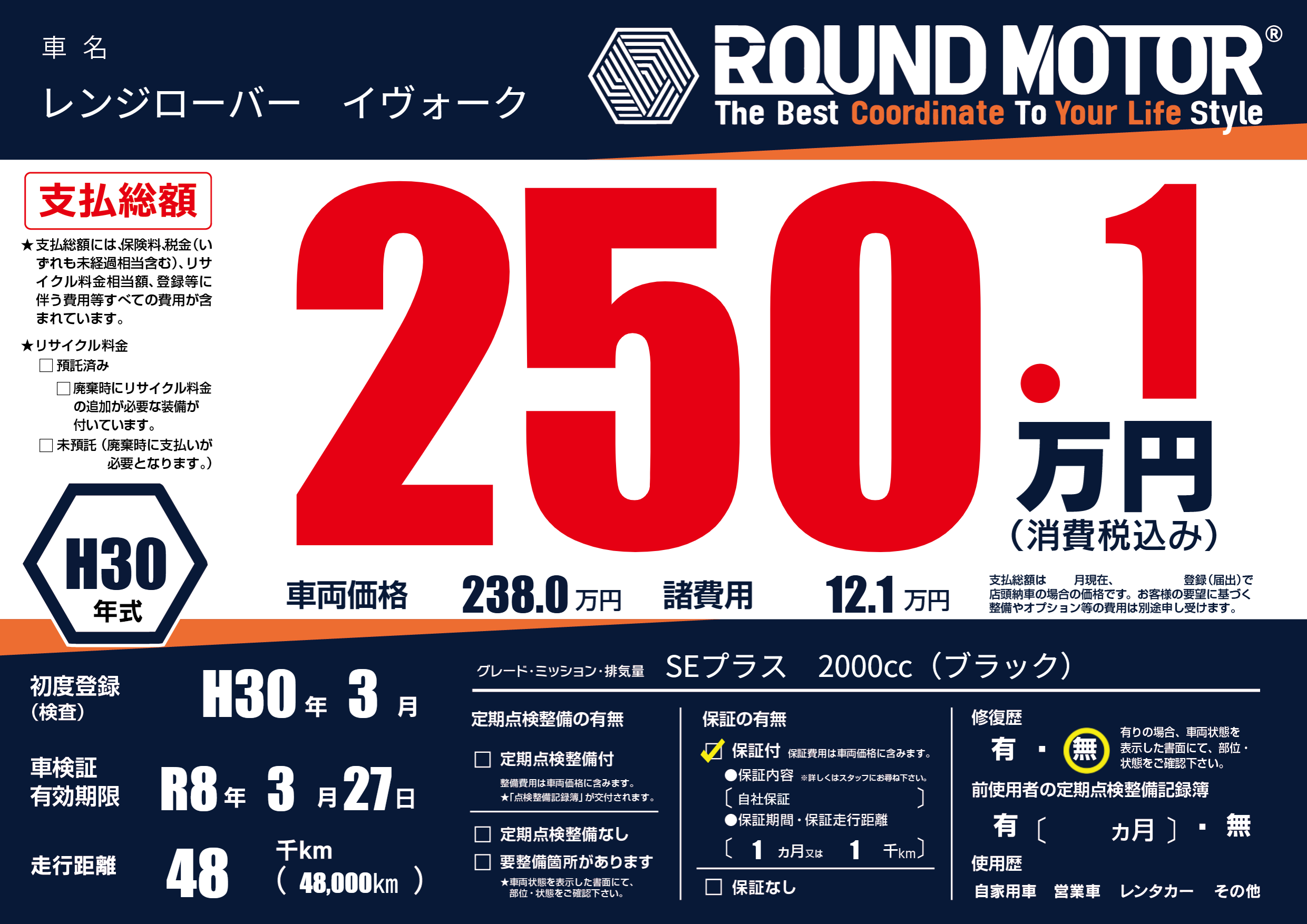 | 走行キロ | 4.8万km | 初年度登録 | H30年3月 |