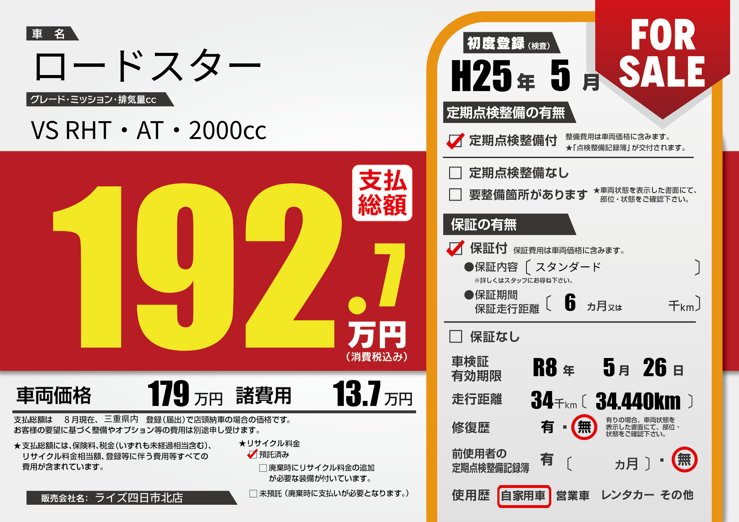 | 車名 | ロードスター | グレード ミッション 排気量 |