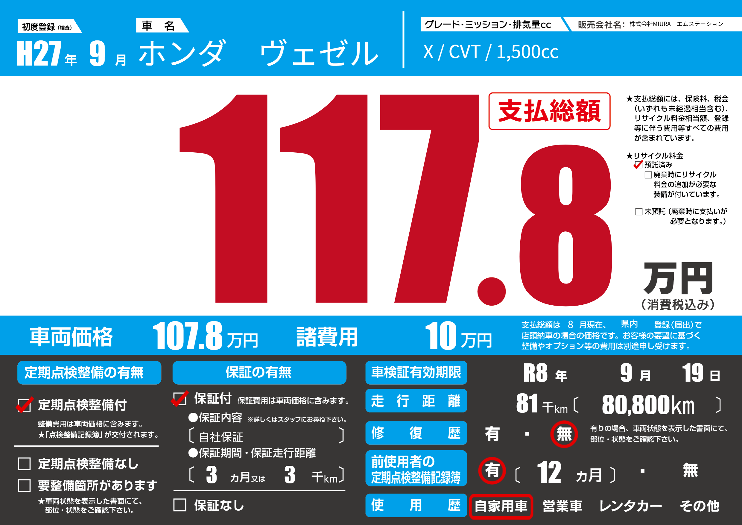 | 初年度登録 | H27年9月 | ||