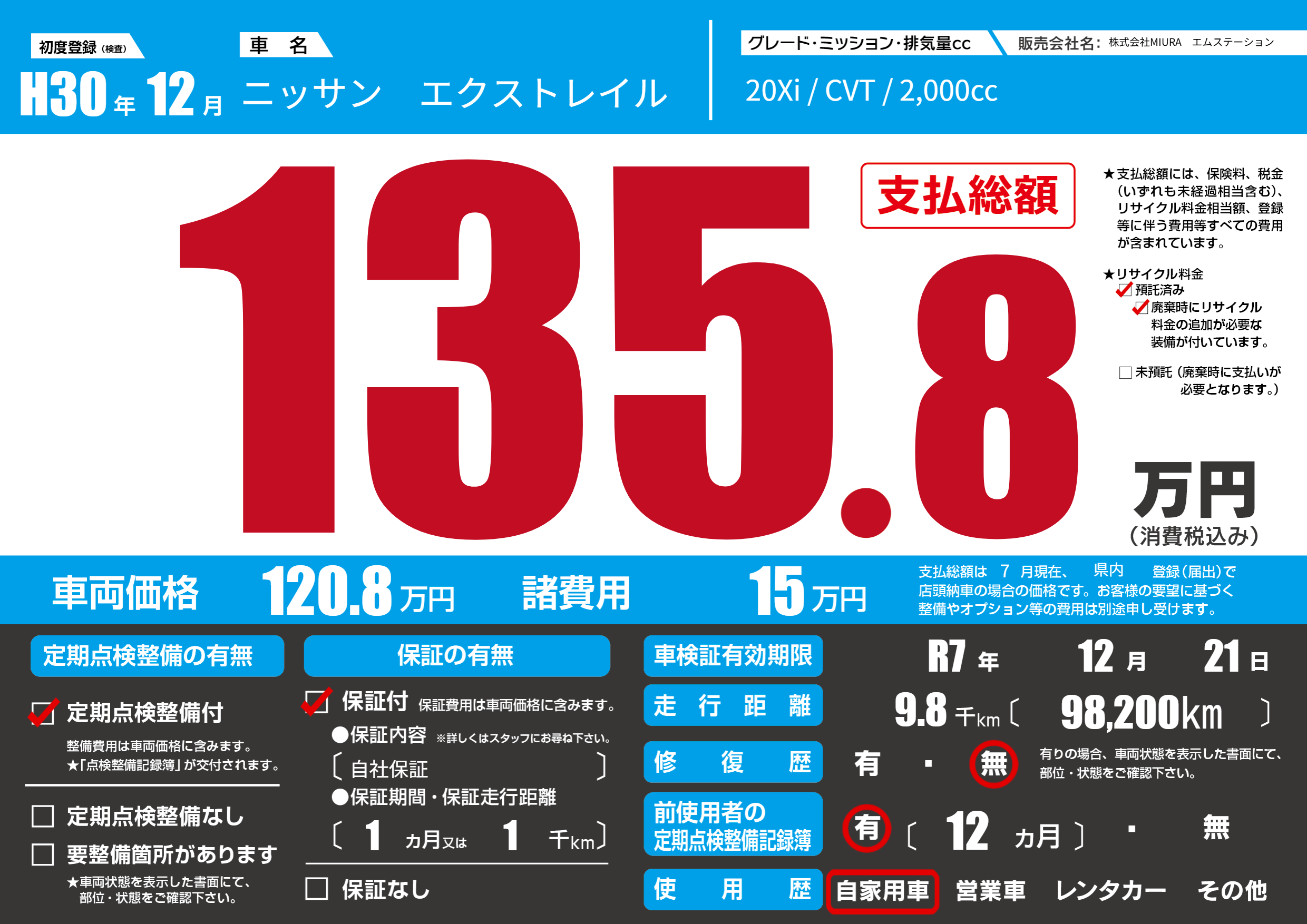| 車名 | ニッサン エクストレイル | グレード ミッション 排気量 |