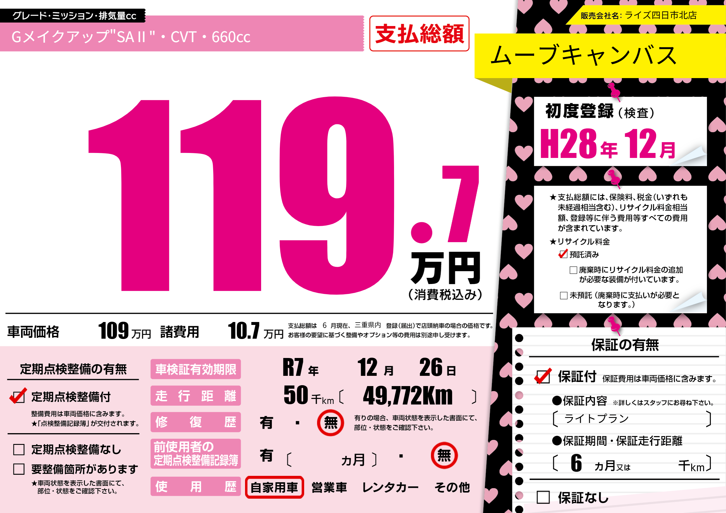 | 車名 | ムーブキャンバス | グレード ミッション 排気量 |
