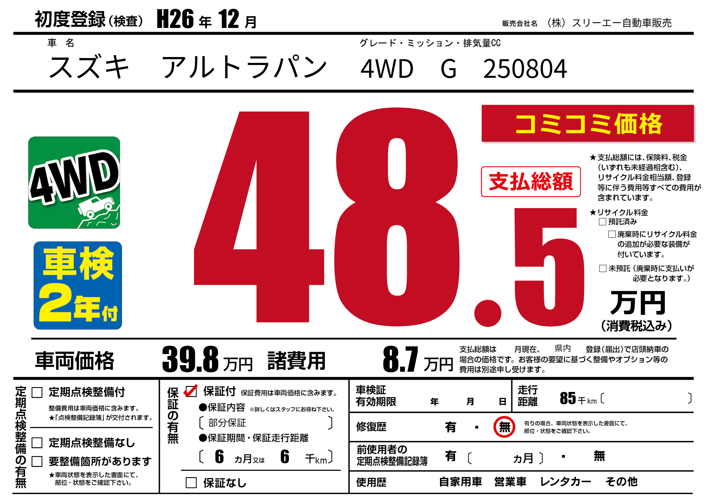 | 走行キロ | 8.5万km | 初年度登録 | H26年12月 |