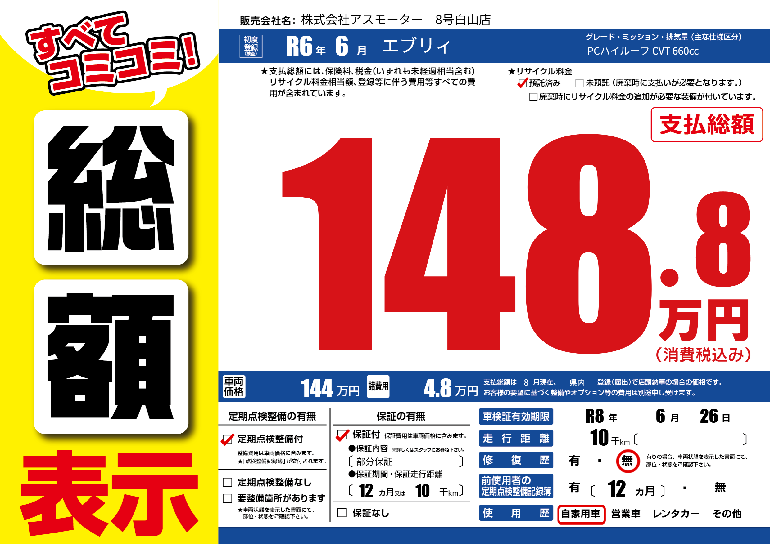 なし | 車検制限 | R8年6月26月 |
