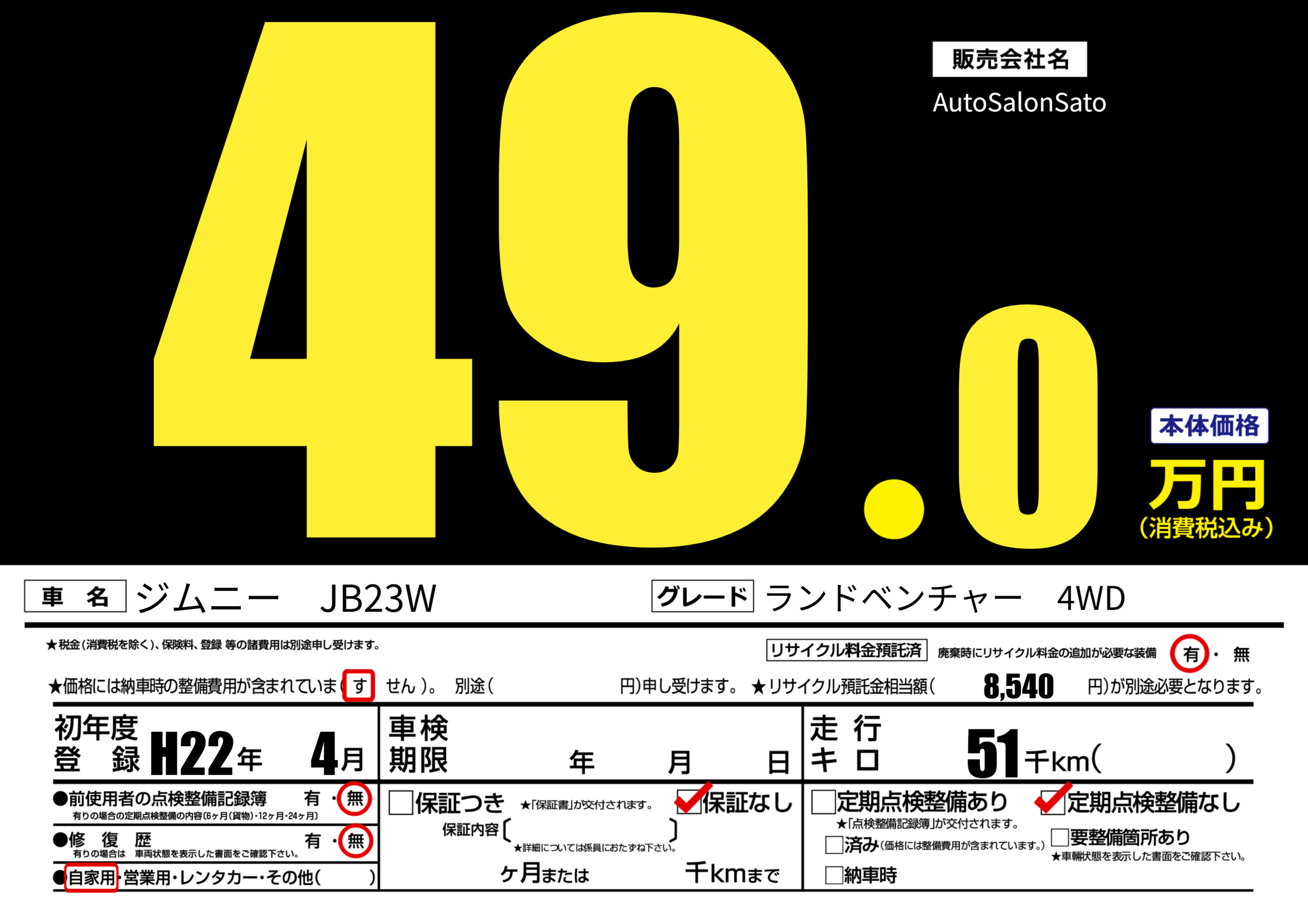 | 走行キロ | 5.1万km | 初年度登録 | H22年4月 |