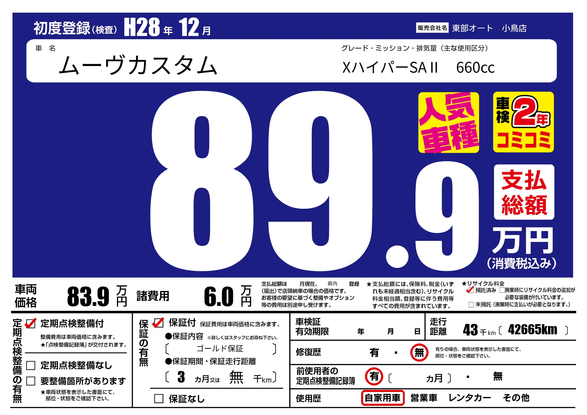 | 走行キロ | 4.3万km | 初年度登録 | H28年12月 |
