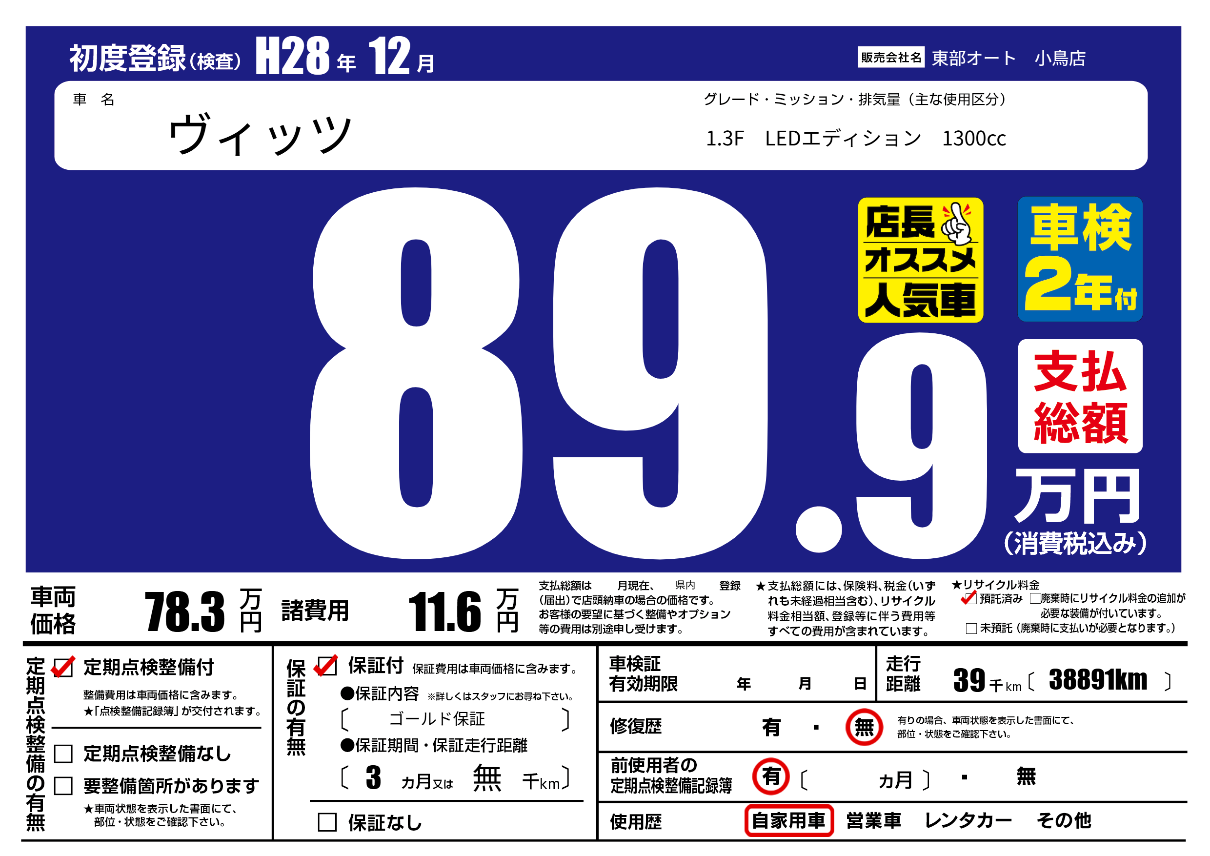 | 車名 | ヴィッツ | グレード ミッション 排気量 |