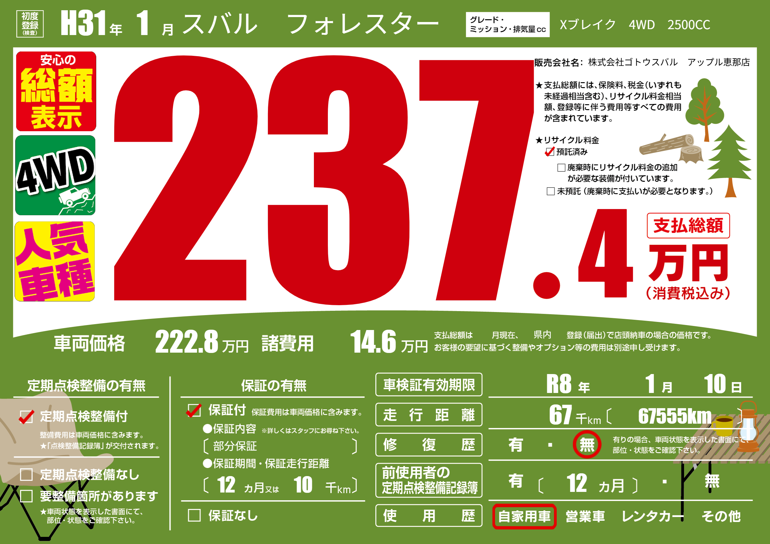 | 車名 | スバル フォレスター | グレード ミッション 排気量 |