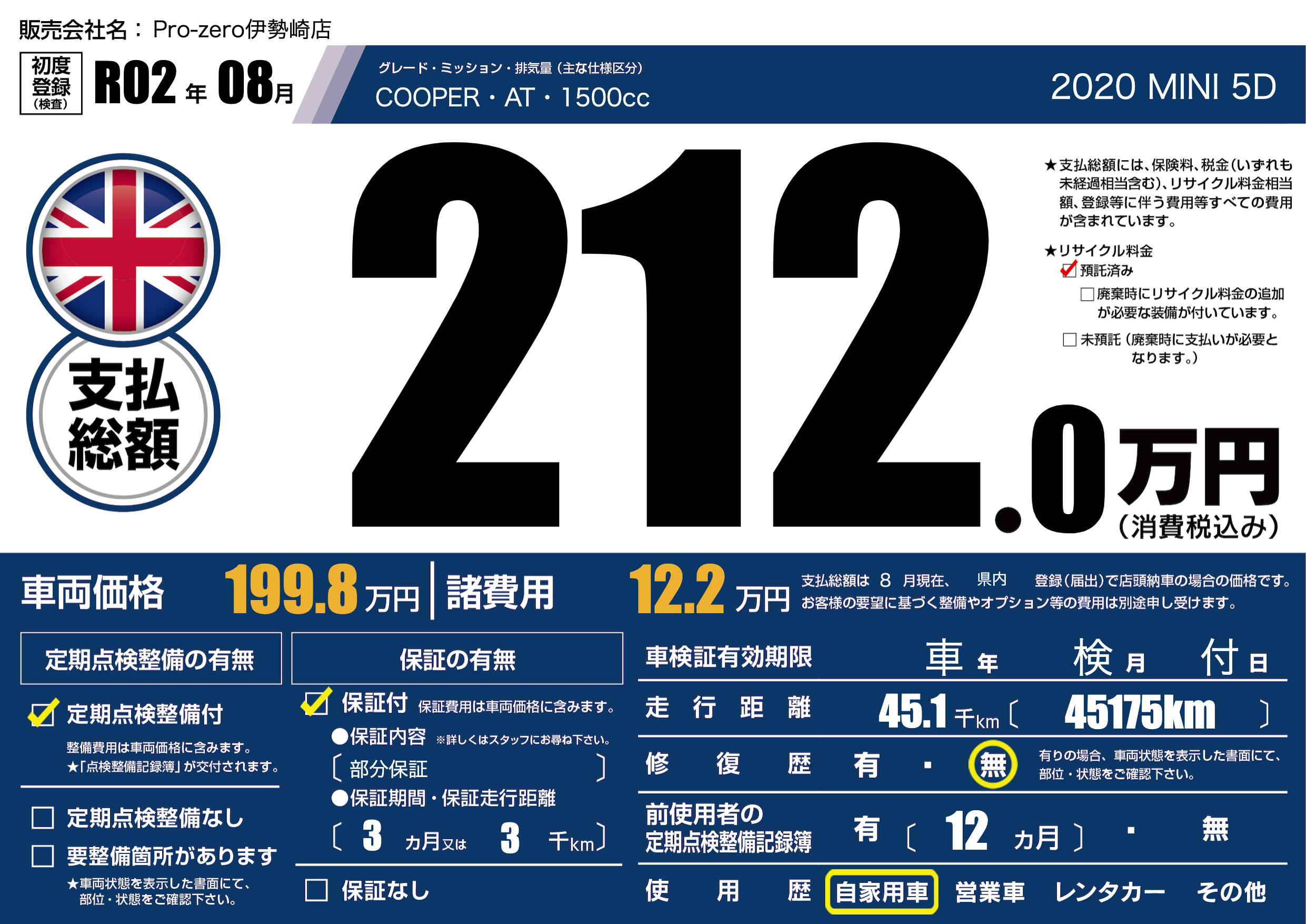 | 車名 | 2020 MINI 5D | グレード ミッション 排気量 |