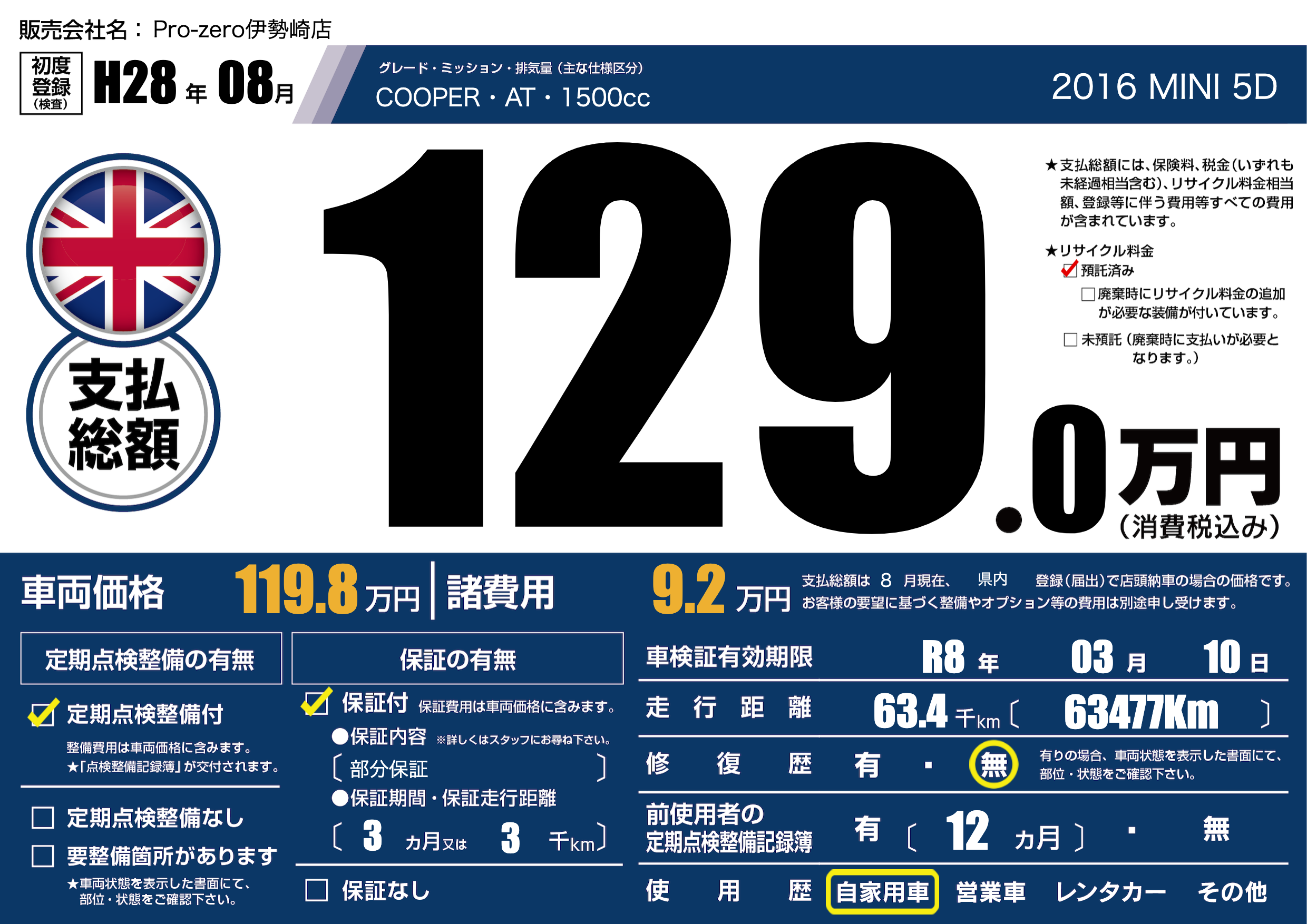 | 車名 | 2016 MINI 5D | グレード ミッション 排気量 |