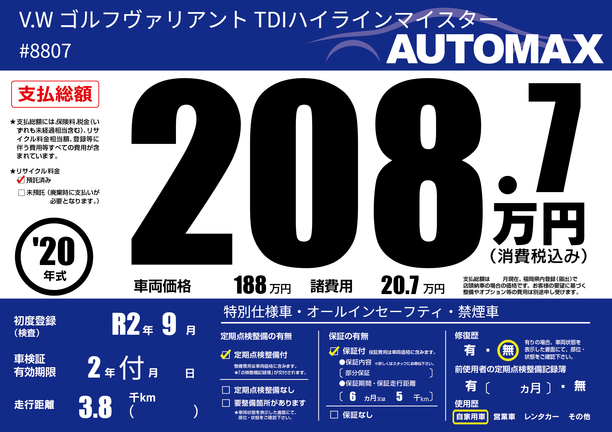| 車名 | V.W ゴルフヴァリアント TDIハイラインマイスター | グレード ミッション 排気量 |