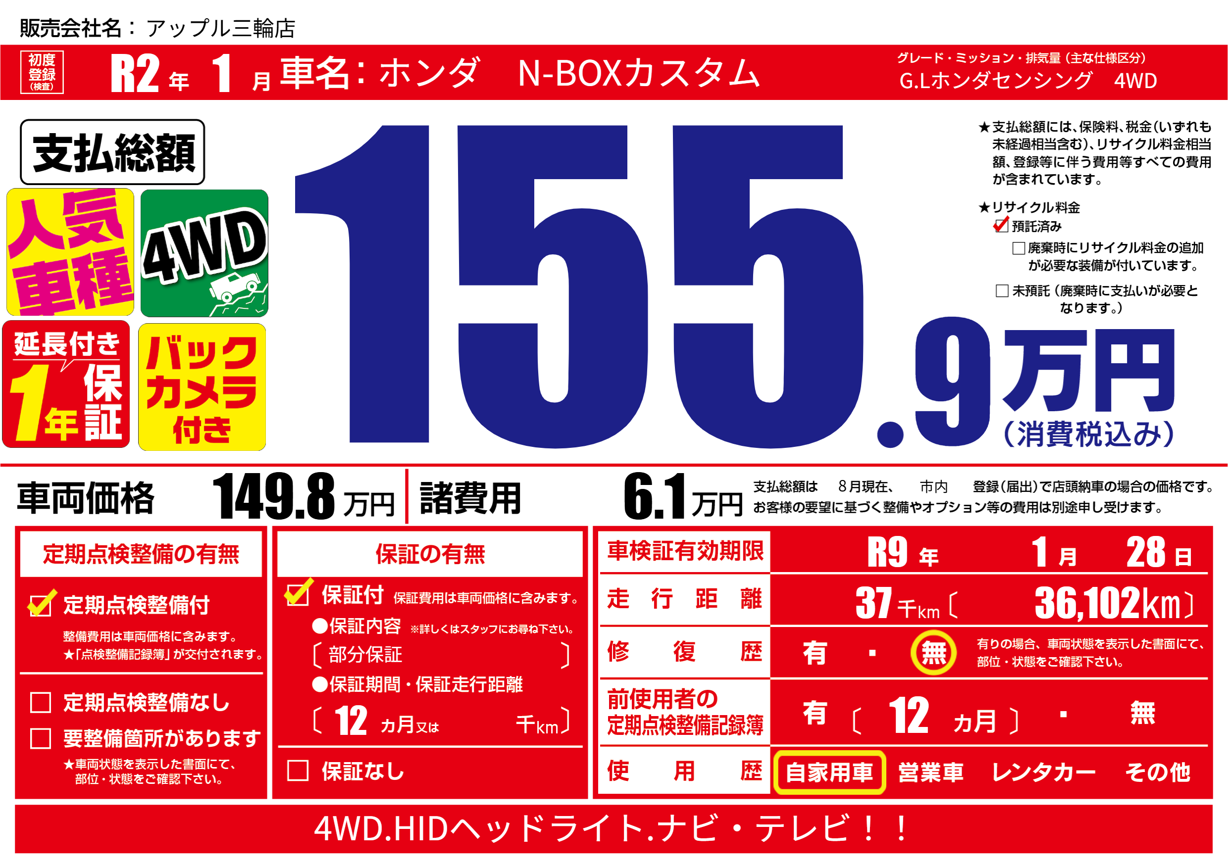 | 走行キロ | 3.7万km | 初年度登録 | R2年1月 |