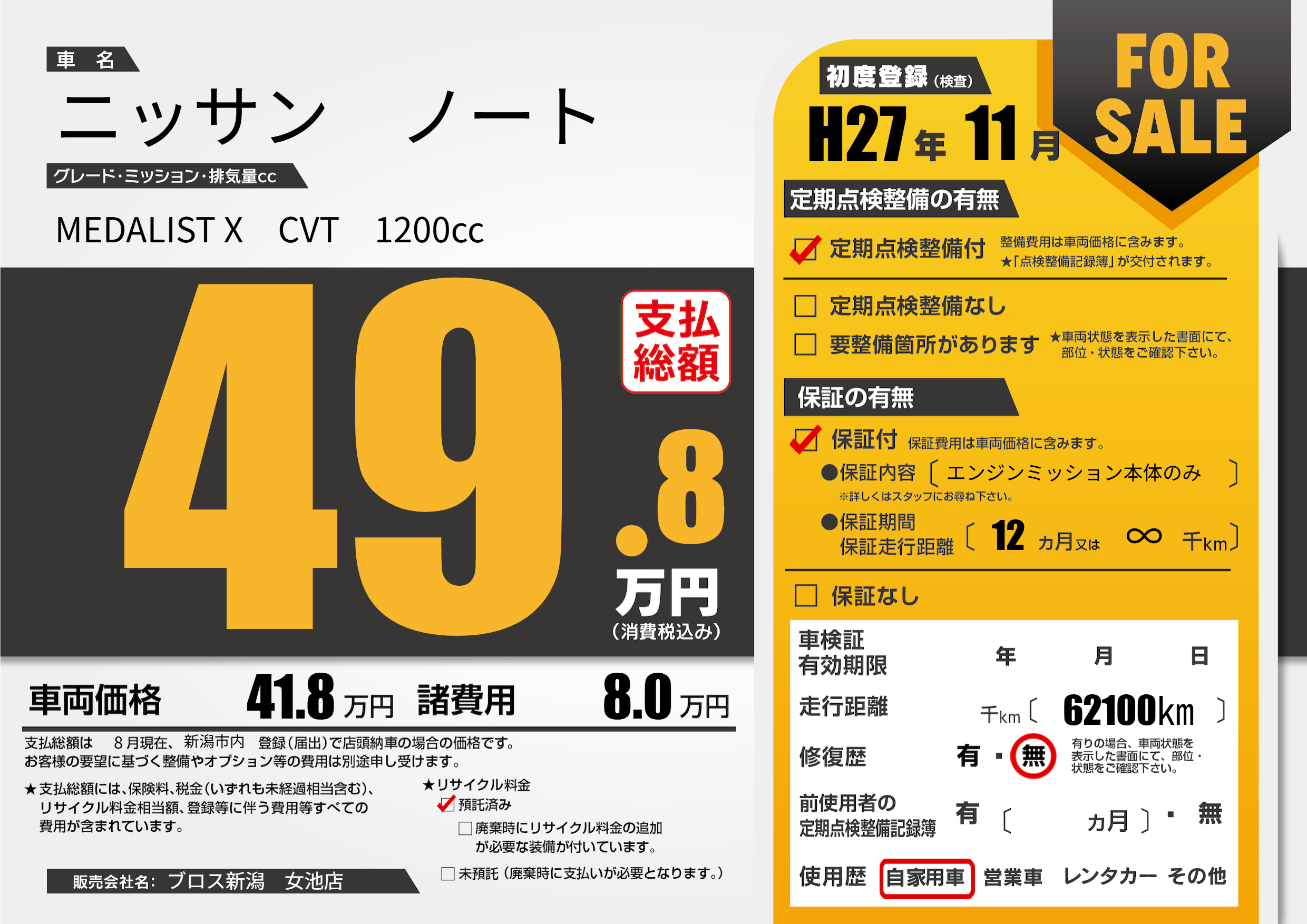| 車名 | ニッサン ノート | グレード ミッション 排気量 |