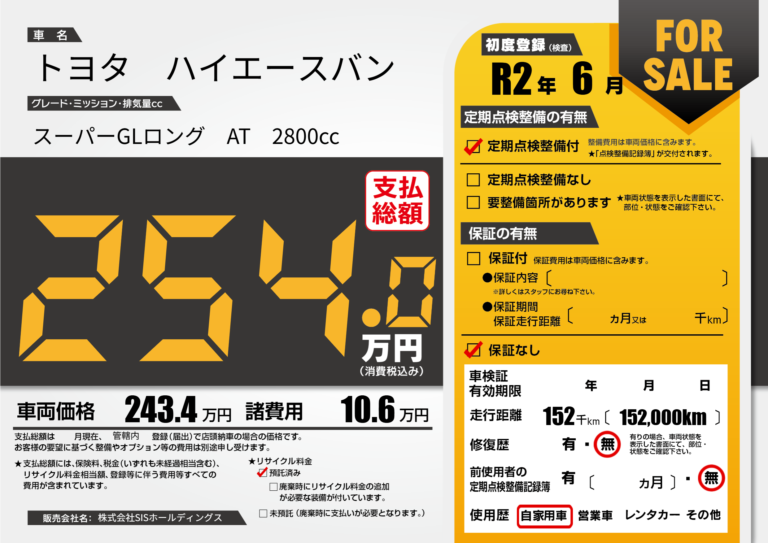 | 走行キロ | 15.2万km | 初年度登録 | R2年6月 |
