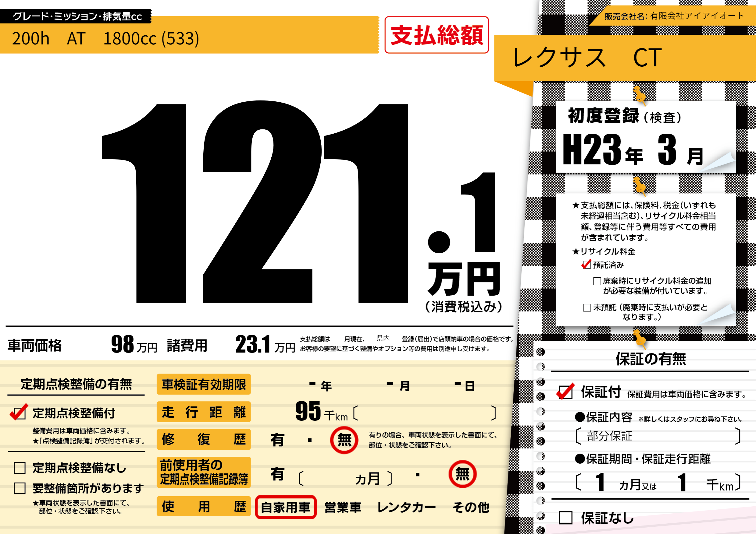 | 車名 | レクサス CT | グレード ミッション 排気量 |