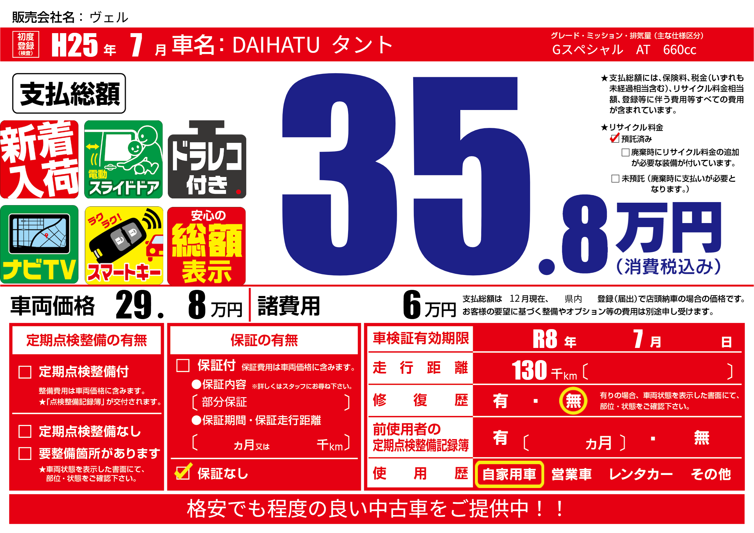 | 車名 | DAIHATU タント | グレード ミッション 排気量 |