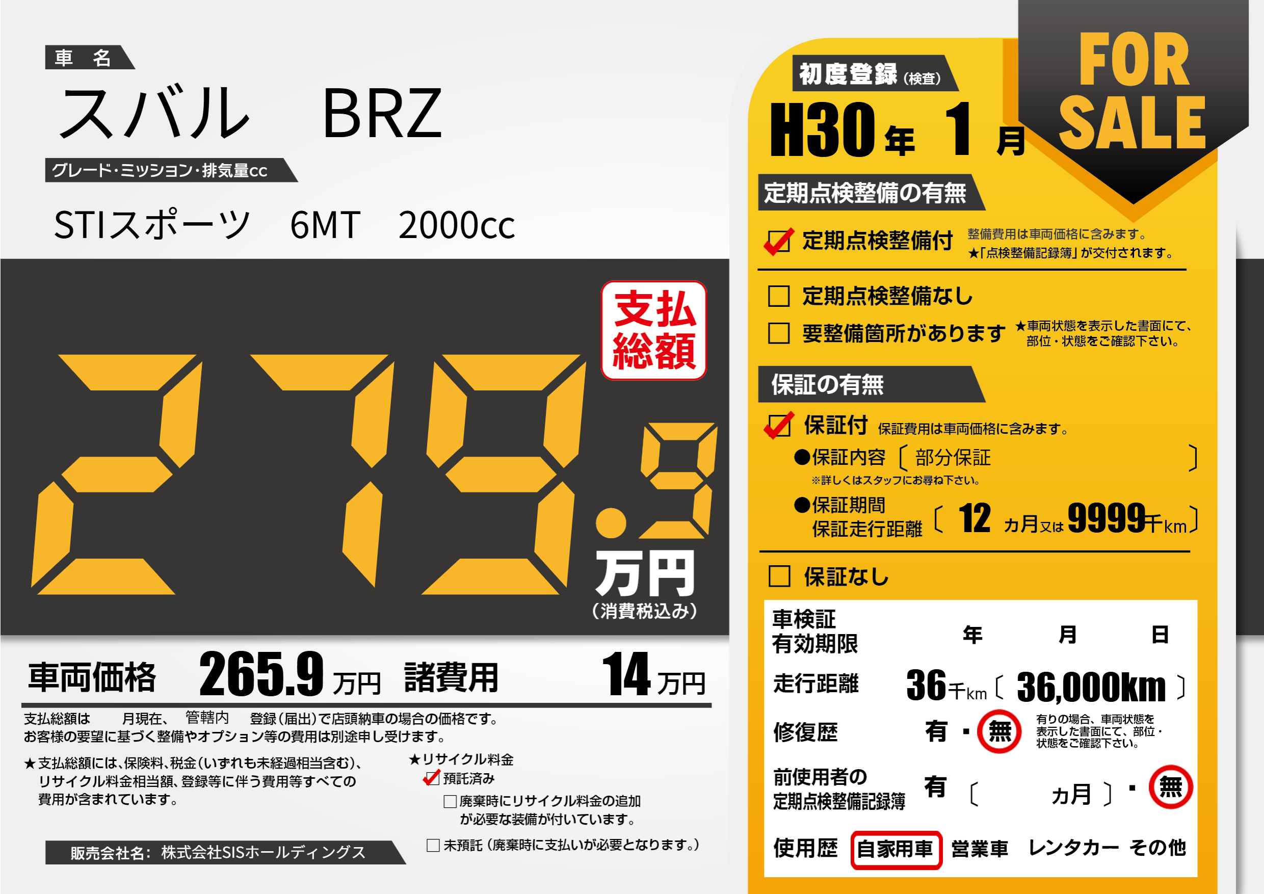 | 車名 | スバル BRZ | グレード ミッション 排気量 |