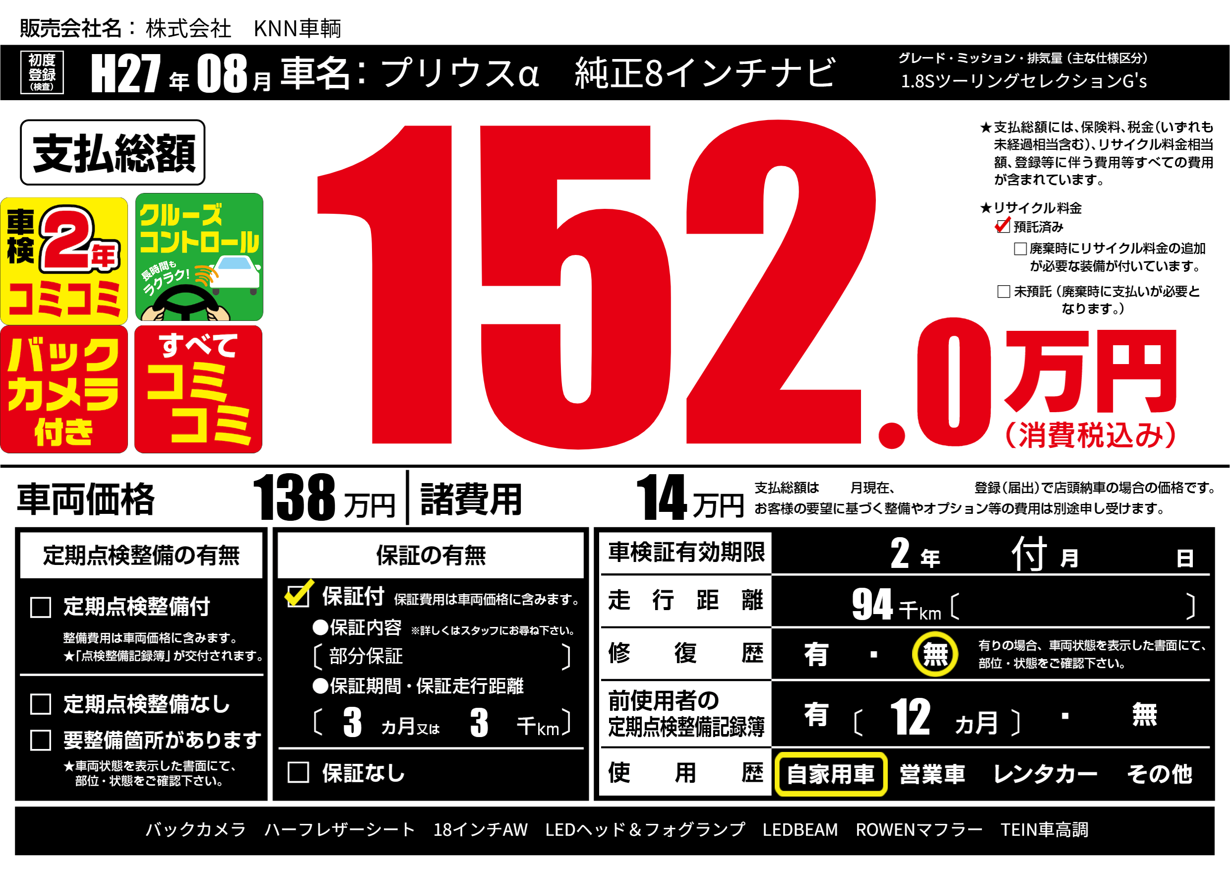 | 走行キロ | 9.4万km | 初年度登録 | H27年08月 |