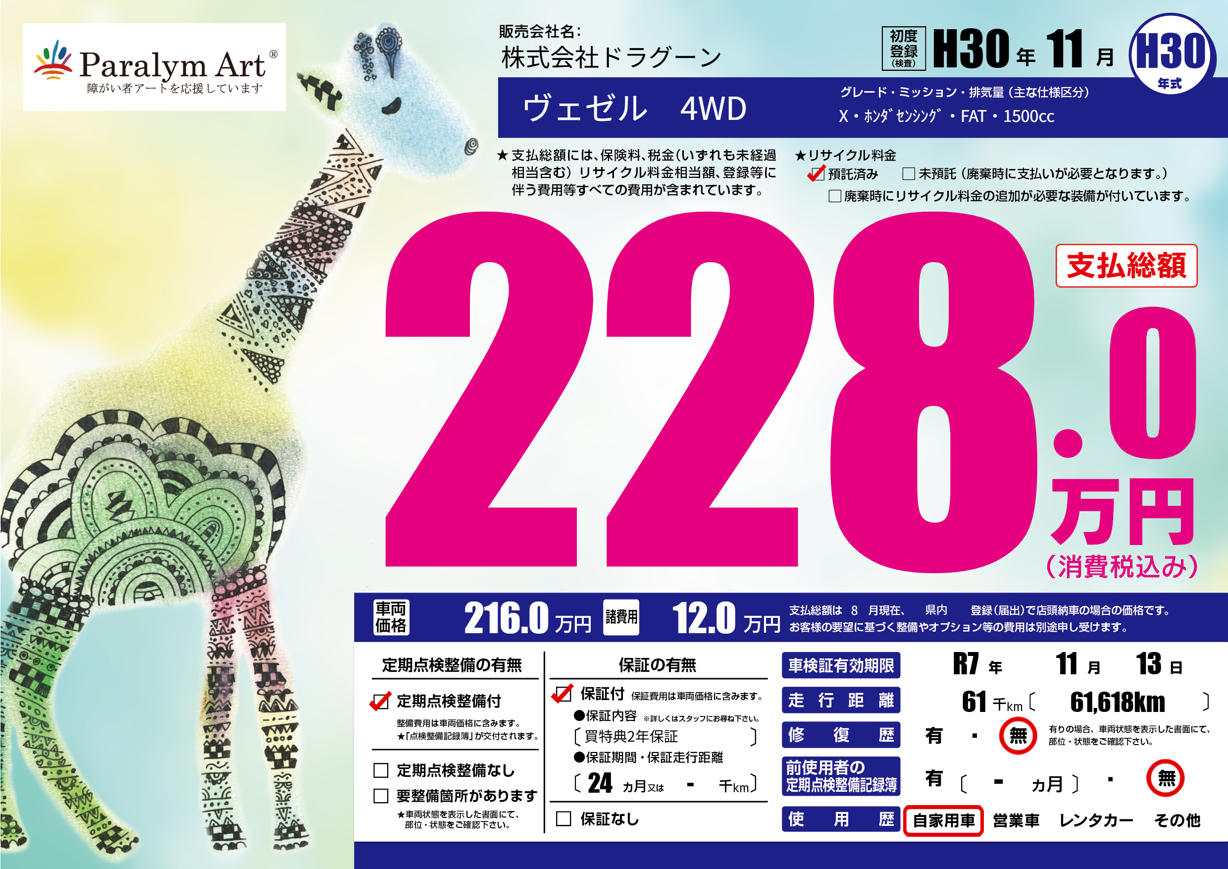 | 車名 | ヴェゼル 4WD | グレード ミッション 排気量 |