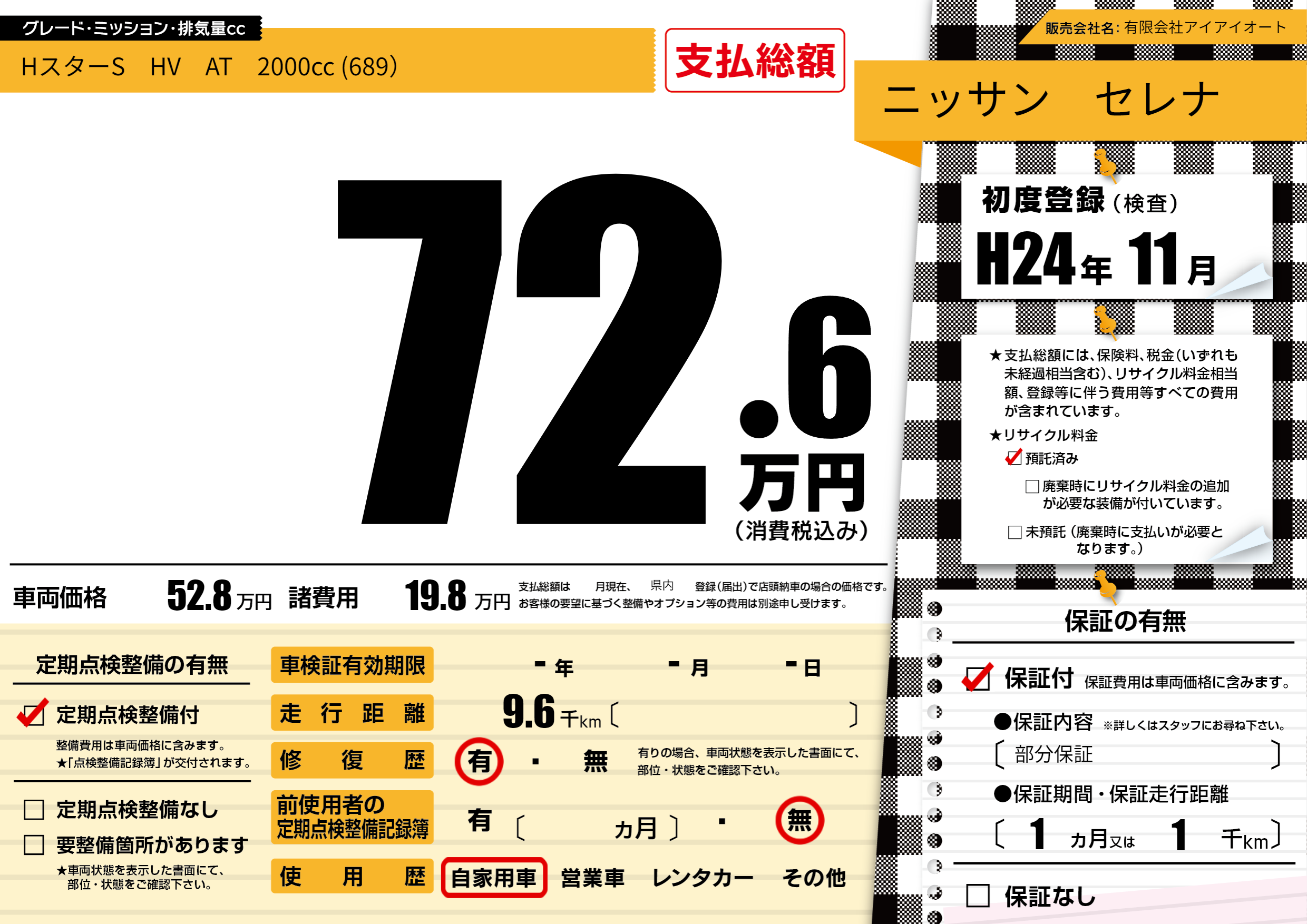 | 走行キロ | 0.9万km | 初年度登録 | H24年11月 |