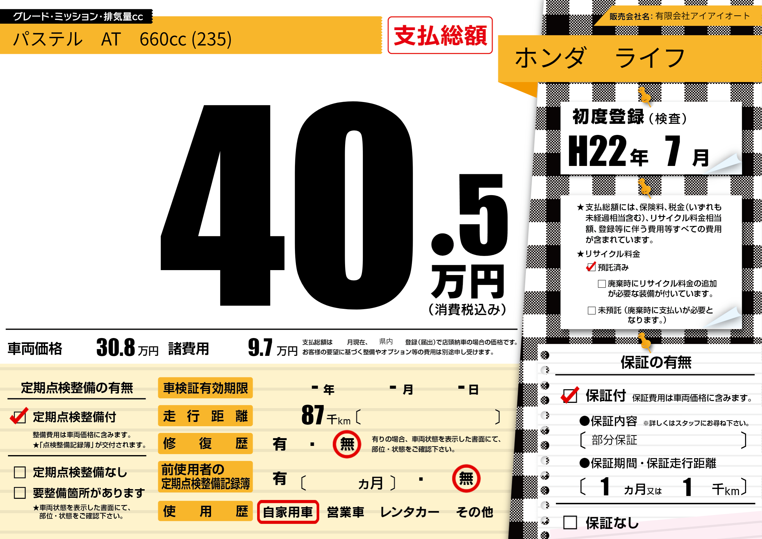 | 車名 | ホンダ ライフ | グレード ミッション 排気量 |